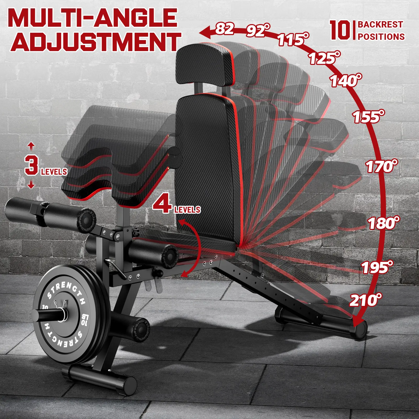 ·Adjustable parameter-- backrest (10 levels), headrest (7-9 inches), seat (4 levels), preacher curl pad (3 levels), lower hook feet (2 levels), handle (3 gears)