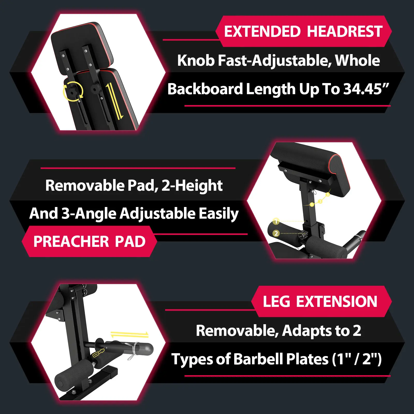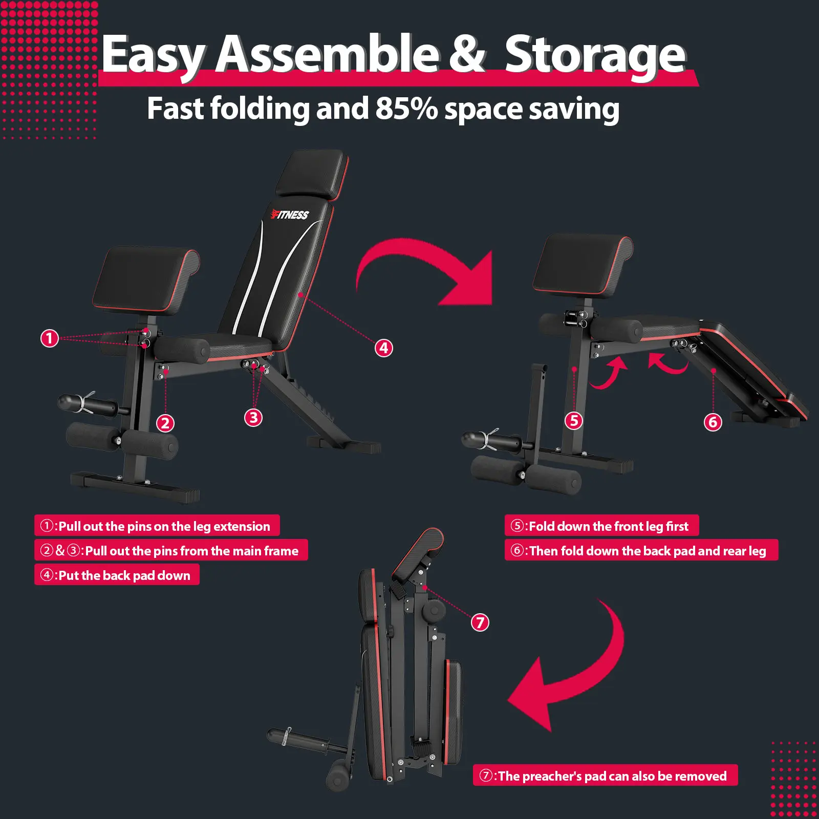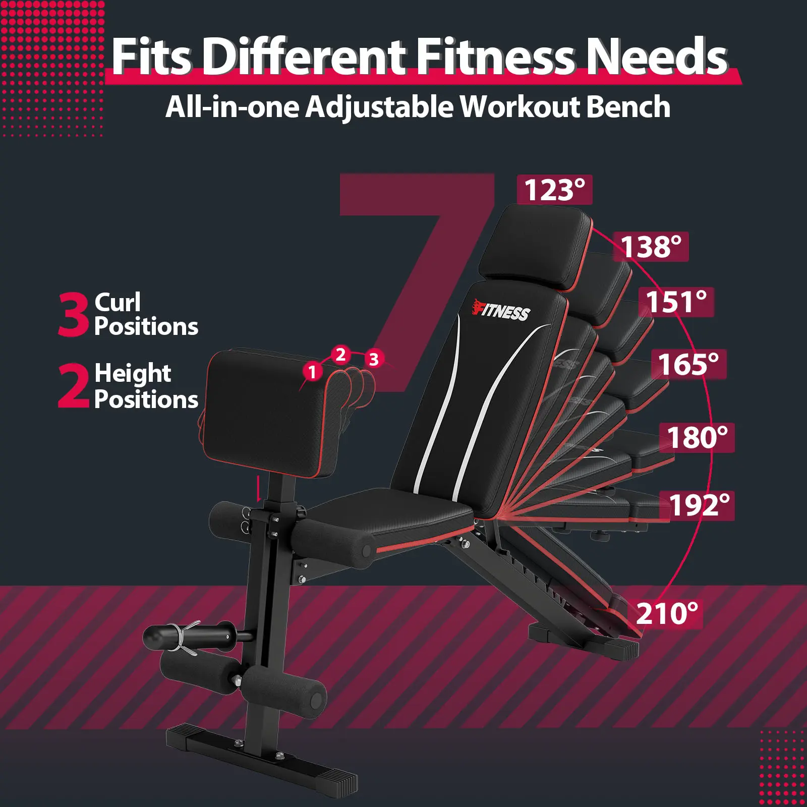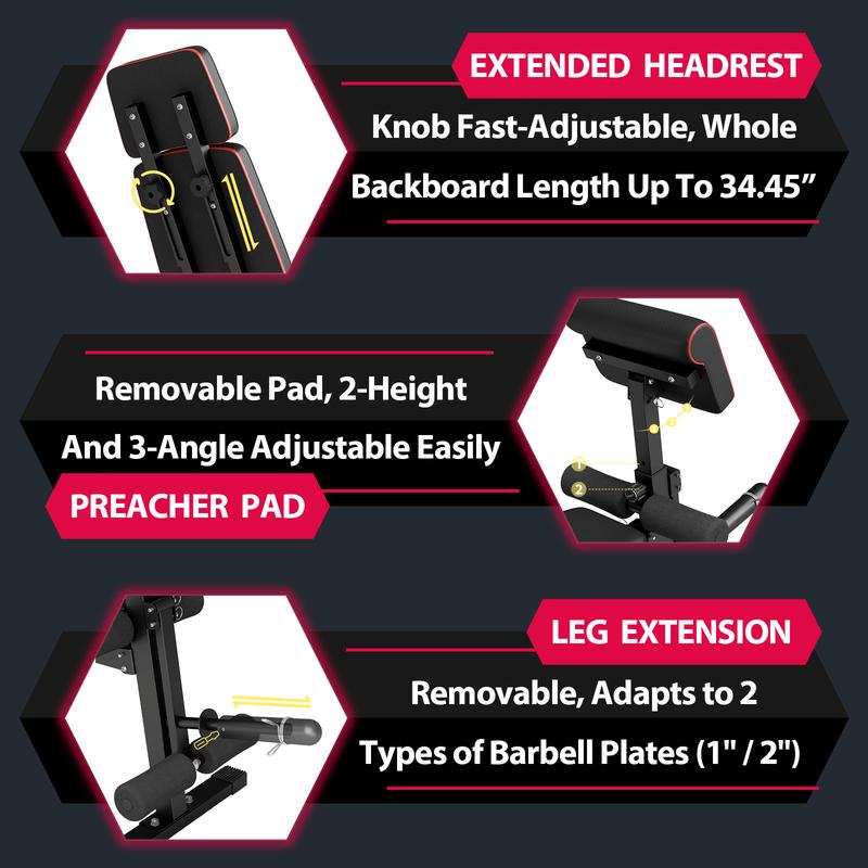 【𝗙𝗮𝘀𝘁 𝗔𝗱𝗷𝘂𝘀𝘁𝗮𝗯𝗹𝗲】 Our adjustable weight bench features 7-gear backrest positions, 3-gear preacher pad positions and flexible leg developer, just lift the backrestto quickly adjust to the incline, decline and flat.