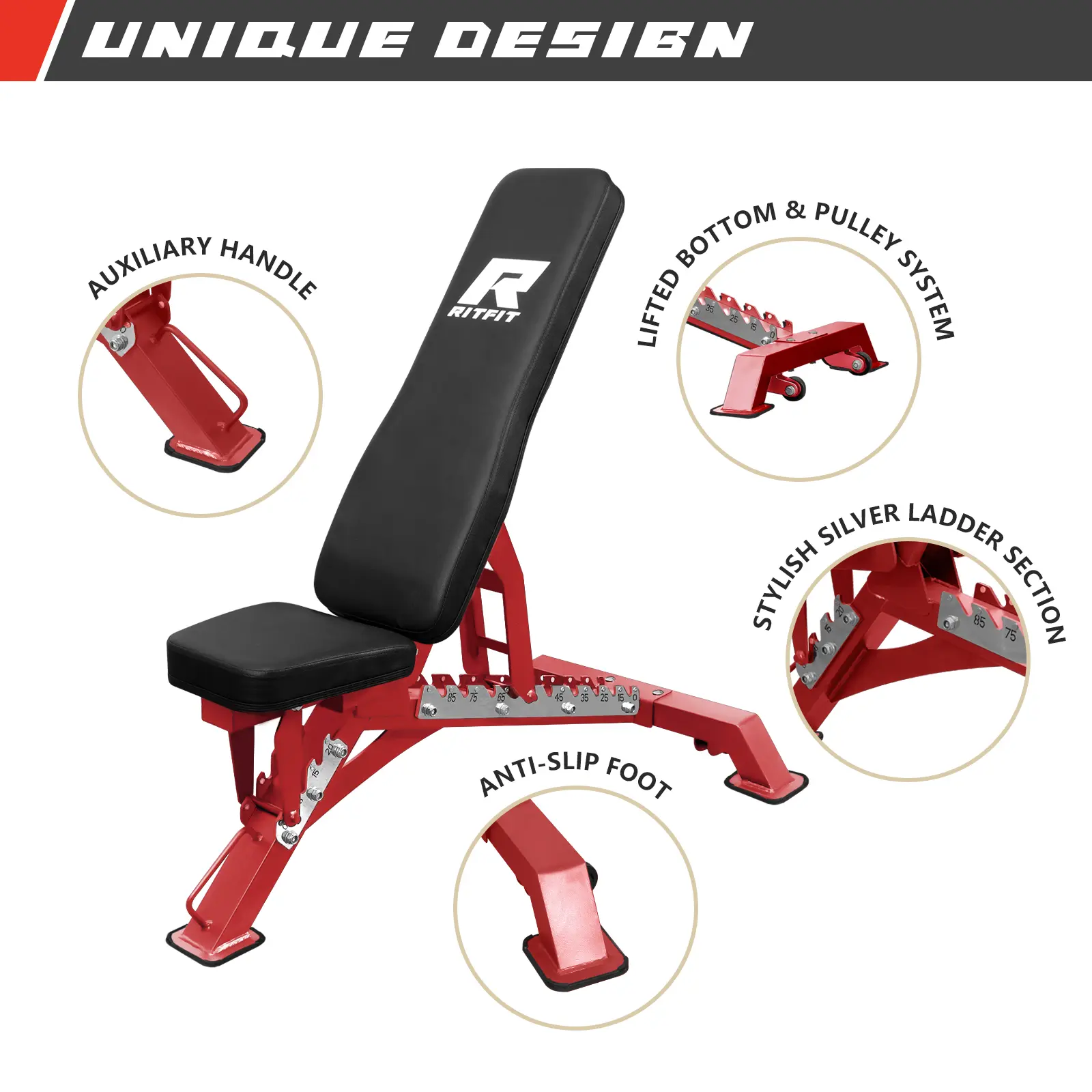 Introducing the RitFit Adjustable Bench BWB01, your ultimate home gym solution. With a maximum load capacity of 1300 pounds, safety and durability are guaranteed. Its unique design and commercial-grade steel construction offer comfort and stability.