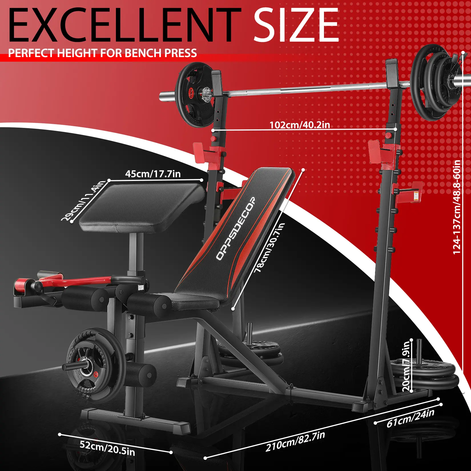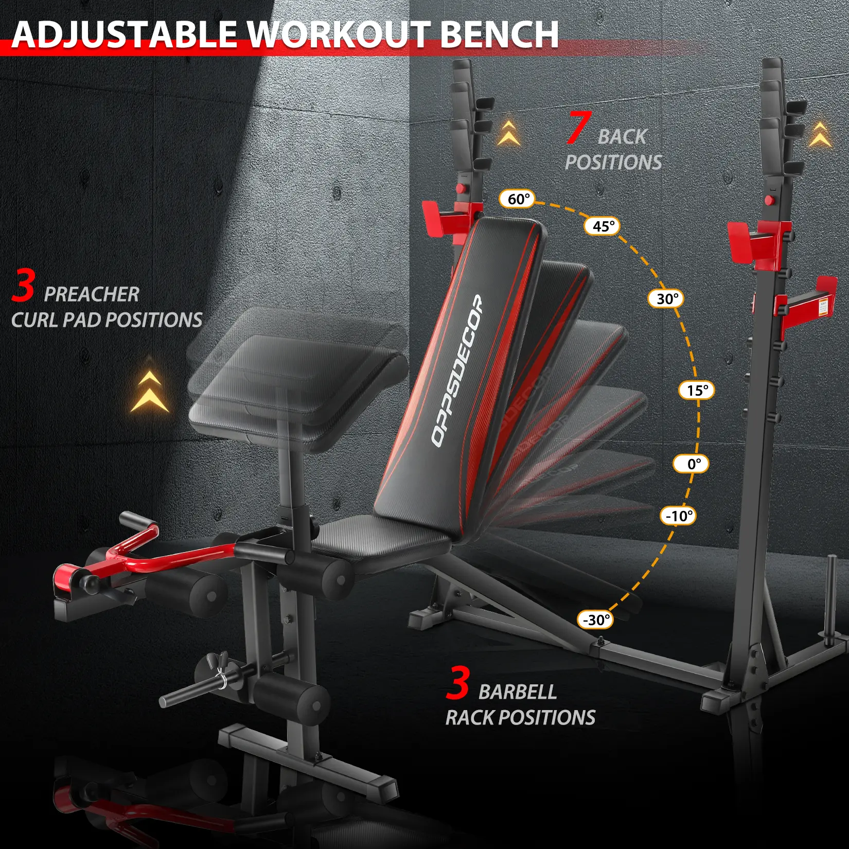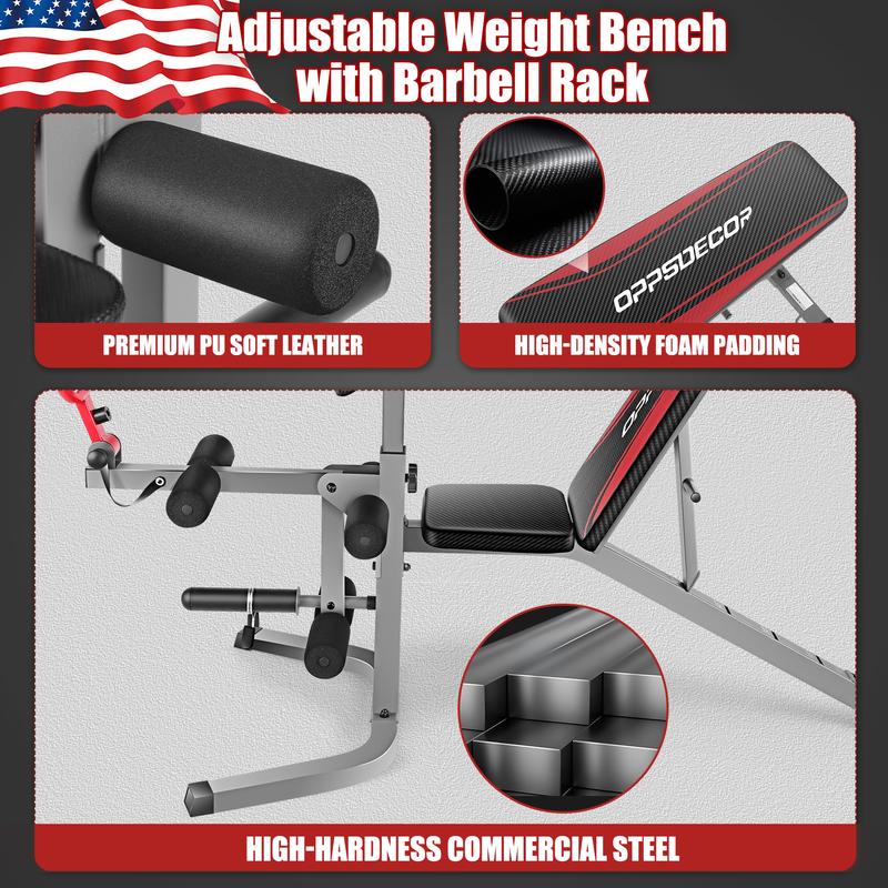 ·OPPSDECOR Versatile Olympic weight bench perfect for full-body workouts. Features 900lbs weight capacity, 7-level adjustable backrest, 4-level barbell rack, and 3-level preacher board. Size: 48.82"L x 22.05"W x 8.66"H. Easy assembly with all hardware included. (Weights not included)
