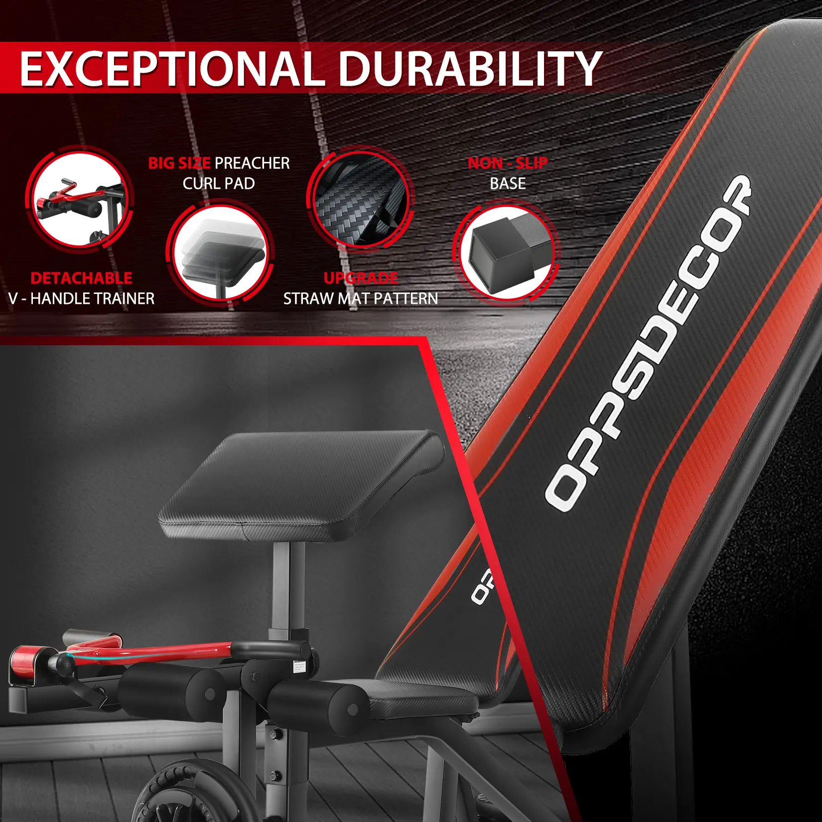 【Upgrade 900 LBS Weight Capacity】The OPPSDECOR Adjustable Weight Bench features upgraded steel and a widened "U" leg design, supporting up to 900 lbs for safety.