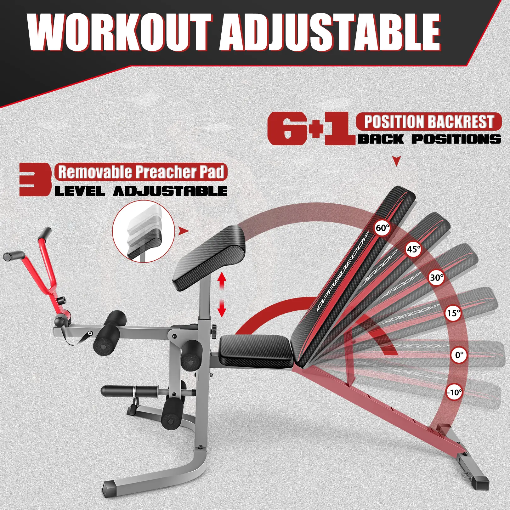 【Adjustable Positions】7 backrest and 3 preacher curl pad positions.