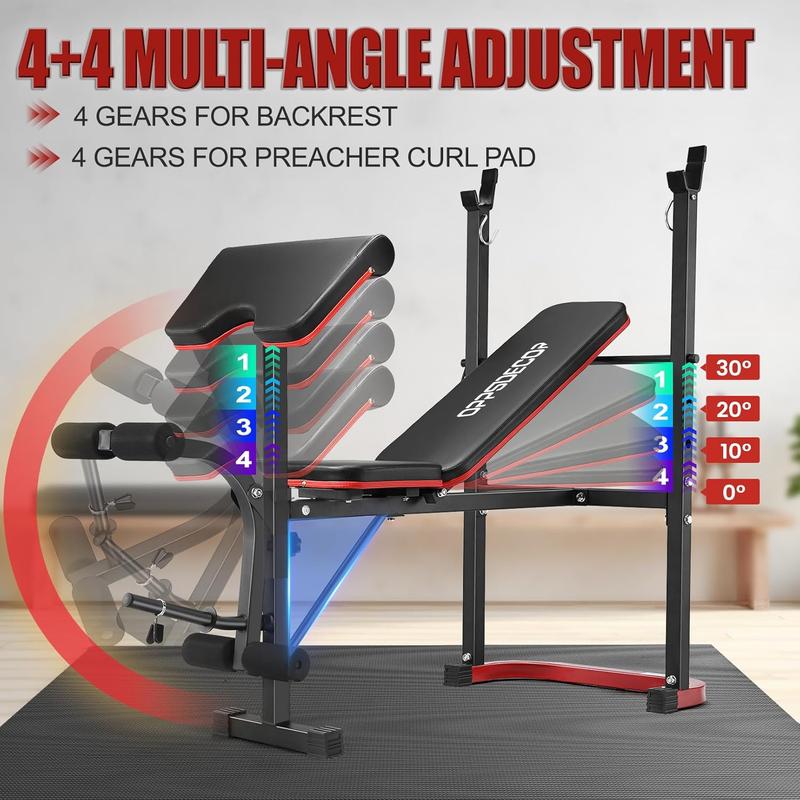 【Innovative U-shaped Stable Design】OPPSDECOR weight bench features a sturdy steel, triangular structure with a U-shaped base and non-slip rubber pads for exceptional stability, perfect for home gyms.   【Barbell Safety Hooks】Secure your barbell easily with safety hooks to prevent slips and enhance safety during workouts.   【100% Satisfaction Guarantee】Includes sorted accessories, detailed instructions, a 2-year warranty, and 24-hour support.   【Adjustable & Versatile】Offers 4 backrest angles and 3 preacher pad positions for customized workouts.   【Detachable Preacher Pad】Enlarged preacher pad for arm exercises, removable for more leg space.   【Multi-function Leg Developer】Includes leg developer for extensions and curls, with customizable resistance.   【Full Body Workout Bench】Ideal for women, teens, and beginners, targeting arms, chest, abs, and legs with exercises like bench press and dumbbell row.