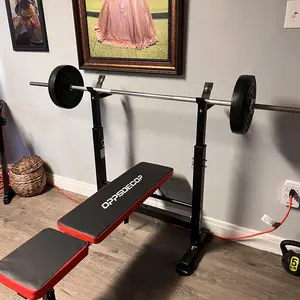 The OPPSDECOR multifunctional workout bench serves as a weight bench, bench press rack, sit-up bench, and squat rack, supporting various exercises like bench presses, dumbbell flies, squats, and more. It's perfect for both simple home workouts and high-intensity training. With 8 barbell rack positions, 8 back pad positions, and adjustable leg positions, it suits all fitness levels. The adjustable foot catch supports stability during decline exercises. Space-saving design folds to 31.5"L x 58.3"H, with non-slip feet for floor protection. Easy assembly with included parts and resistance bands. Barbell and weights not included.