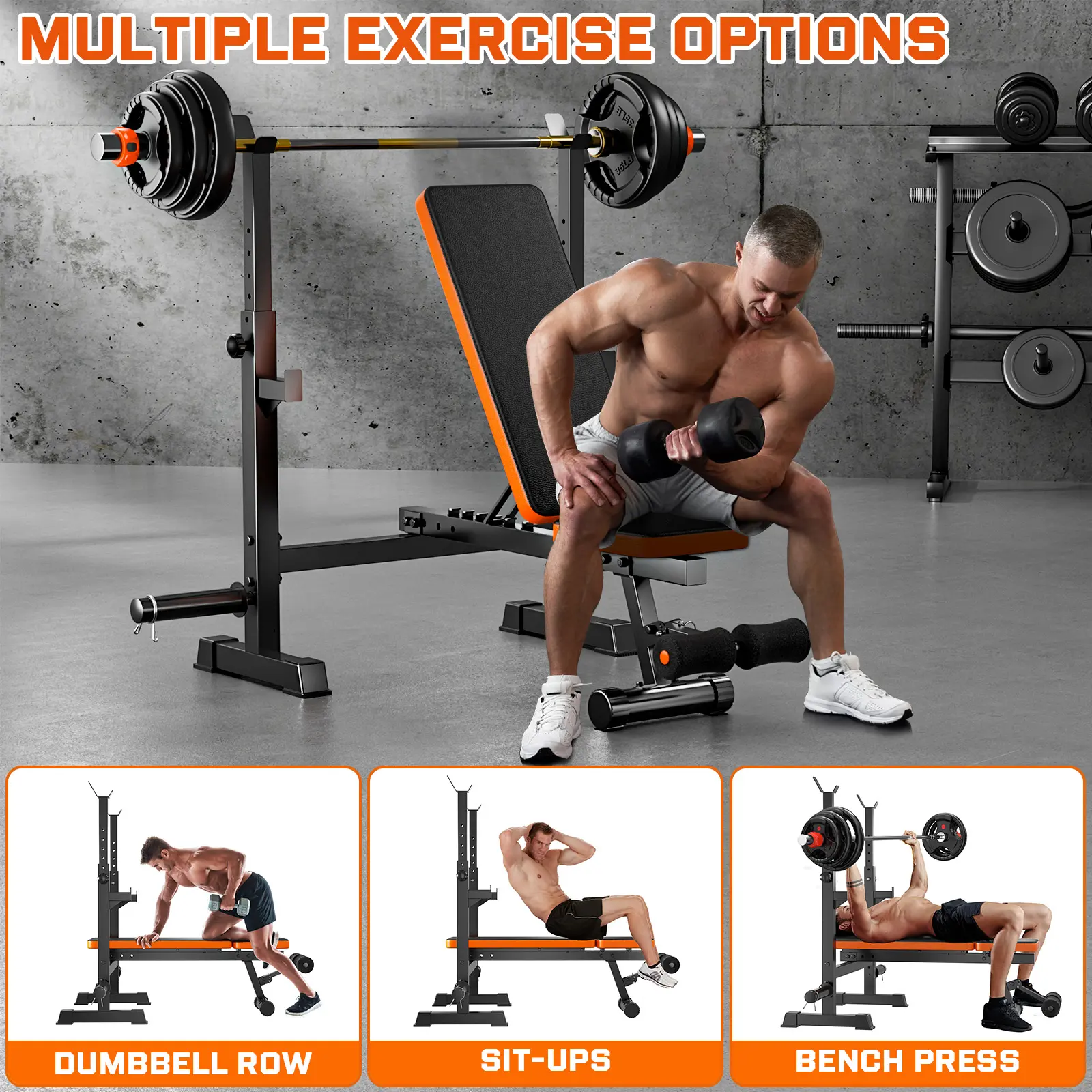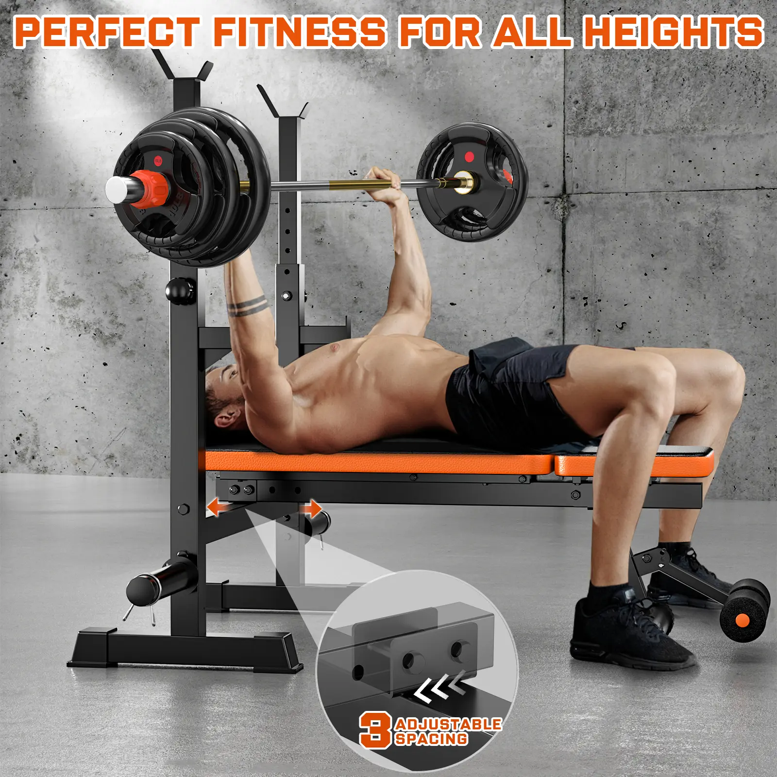 Hapsor Adjustable Weight Bench Set - Multi-Functional Press Rack with Squat Stand, Home Gym Olympic Weight Bench, Removable Foot Catch, Dumbbell Storage, Supports 770LBS, Bold Orange & Black Workout Equipment - Springtok