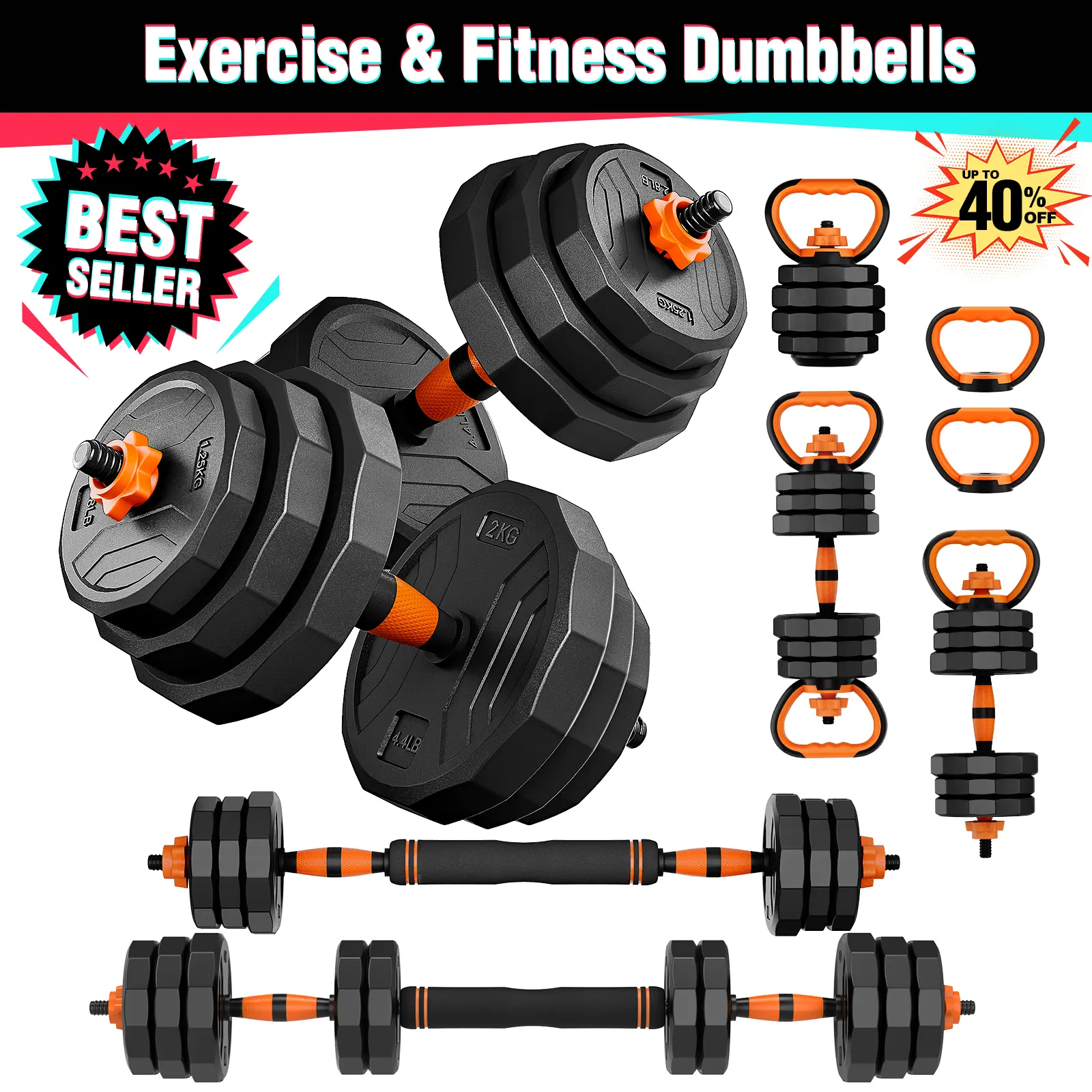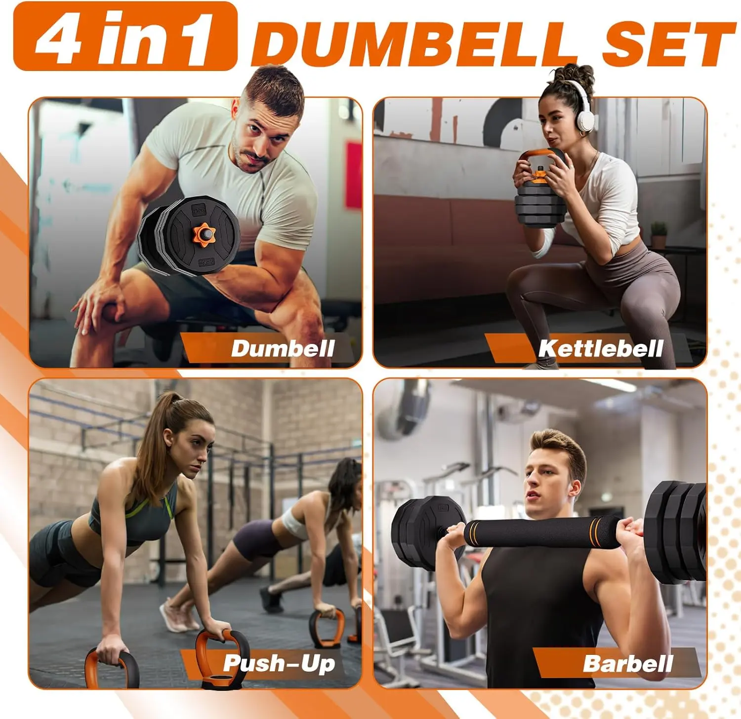 【Multifunctional Dumbbell set】The adjustable weights dumbbell set can quickly switch between dumbbells, 3 types of kettlebells, 2 types of barbells, a push-up stand for full-body workouts like bench presses and squats. Ideal weights dumbbell set for home fitness!