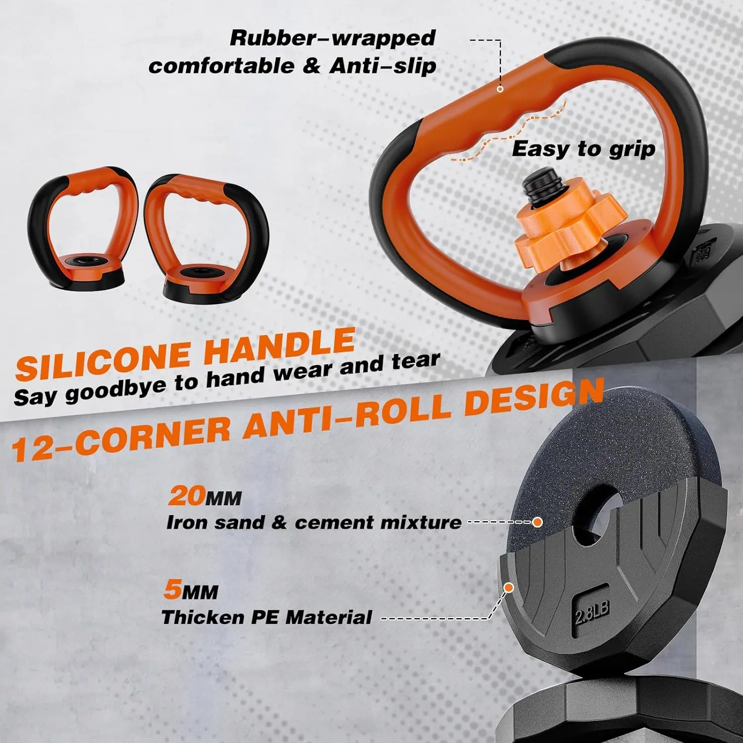 【Anti-Slip Design】The kettlebell handles are wrapped in comfortable anti-slip silicone, barbell handles with textured grips for enhanced palm friction, ensuring a secure hold during workouts.