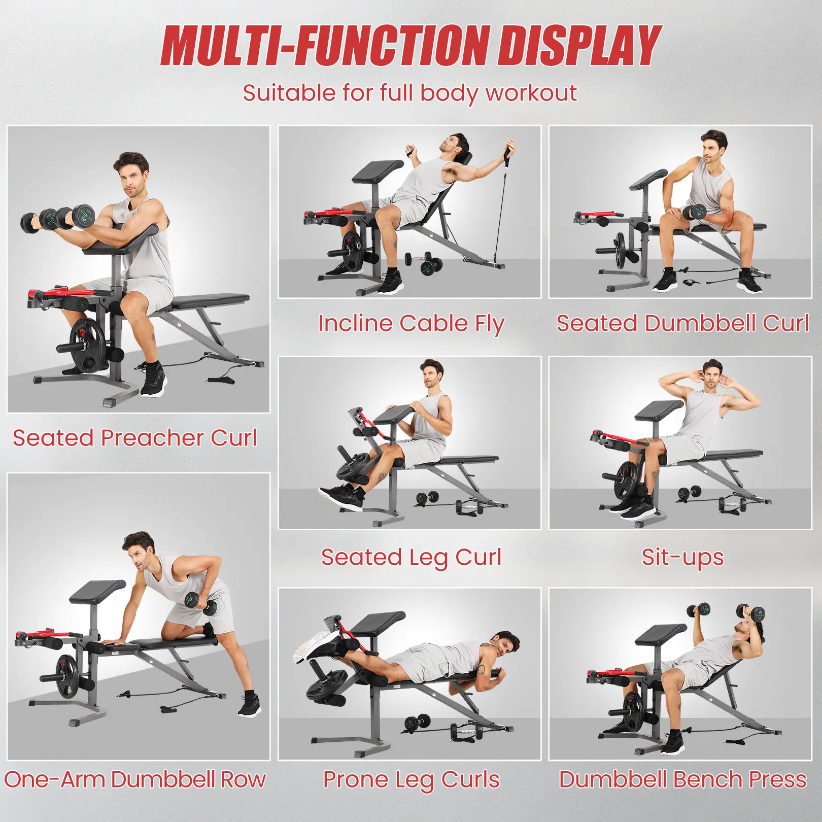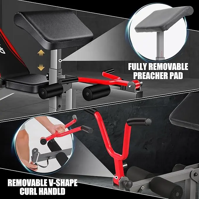 【Weight Bench with Leg Extension/Curl】Includes removable preacher pad and leg extension machine for versatile workouts.