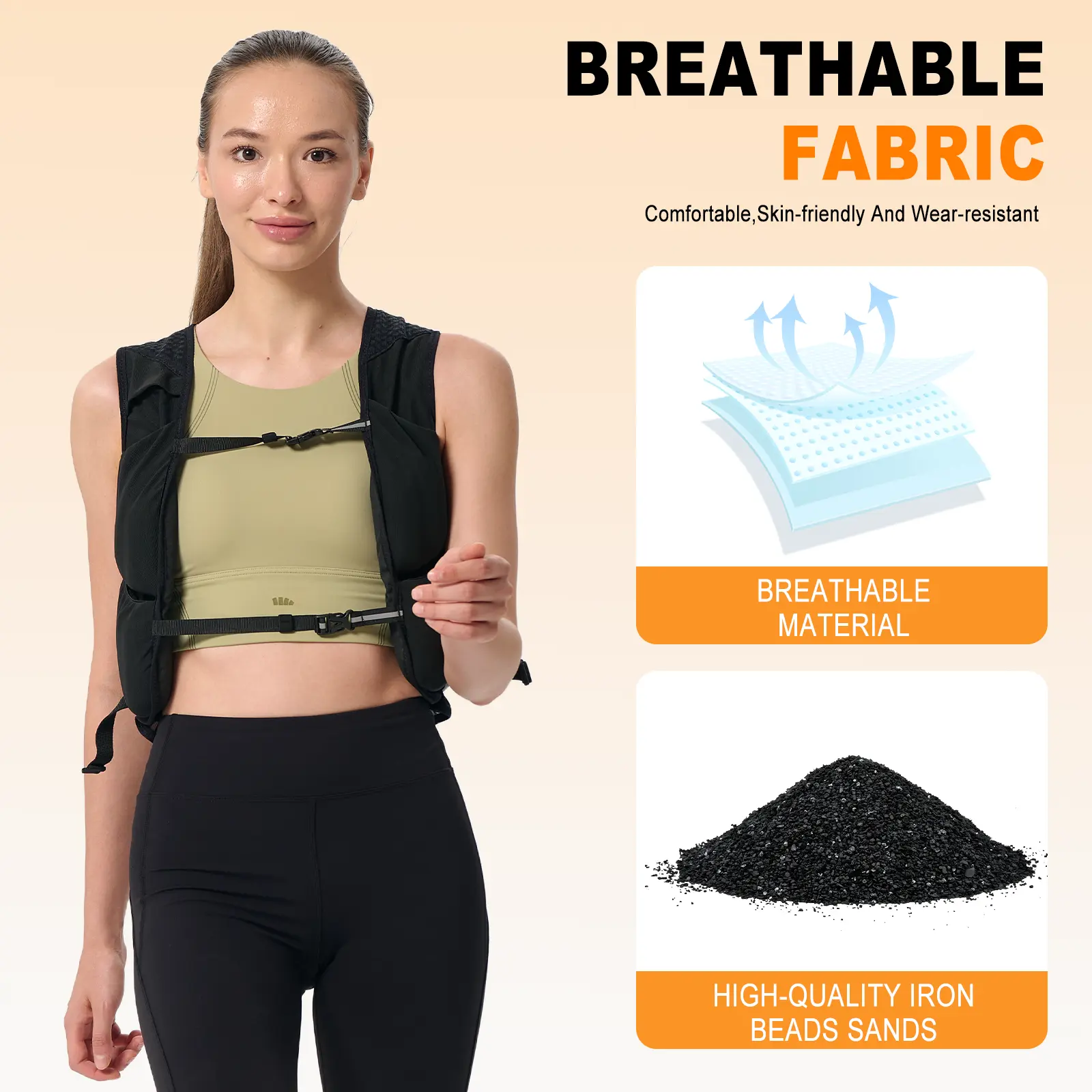 This vest is easy to put on and adjust....it comes with 10 double stuffed sand bags to equal the 19lbs....the vest is mesh on the sides which makes it very breathable....its also washable bcuz u will get sweaty 😓