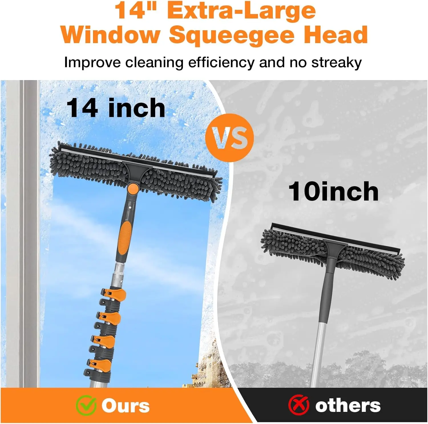 14" Oversized Head: 36% wider than standard 10-inch tools, cuts cleaning time/effort, delivers streak-free shine on large glass