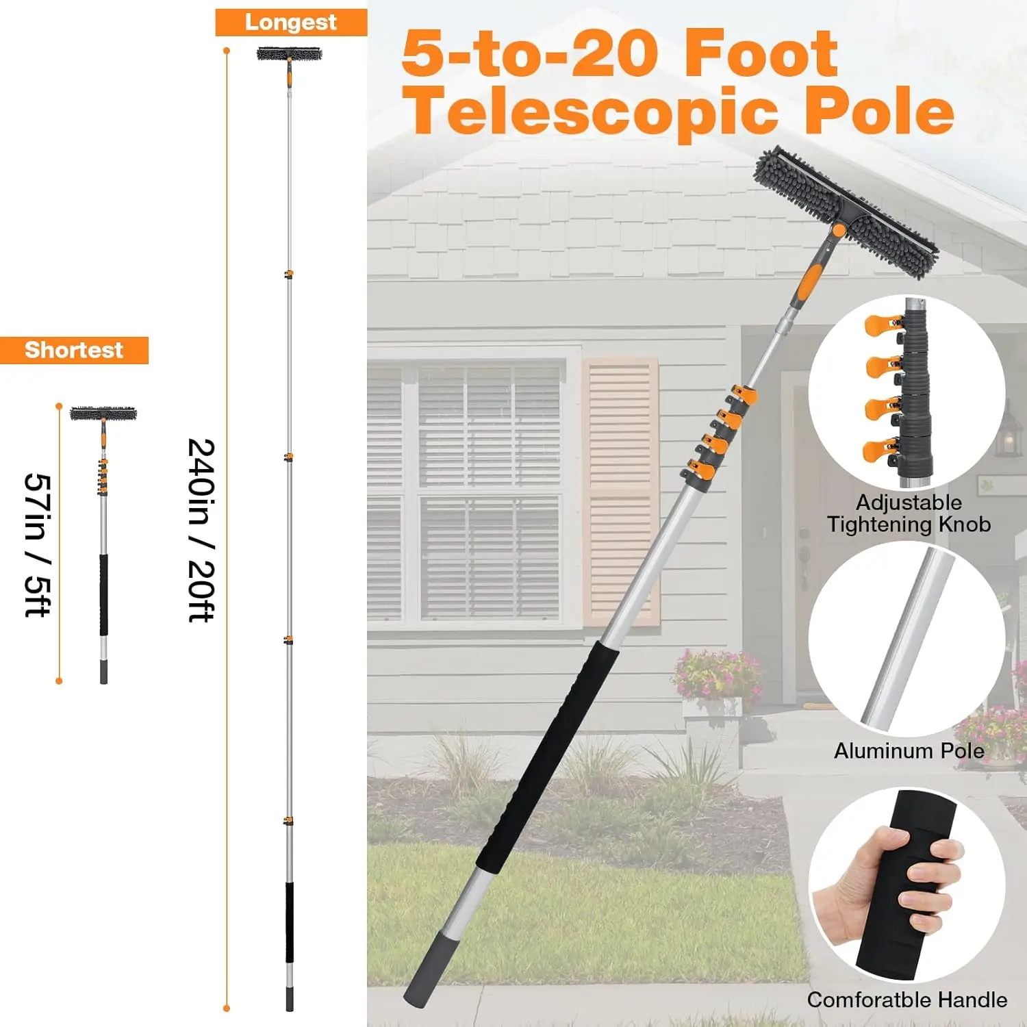 5-20ft Aluminum Pole: Lightweight, 5-stage telescopic, stable & non-bending, reaches 2nd/3rd story windows safely
