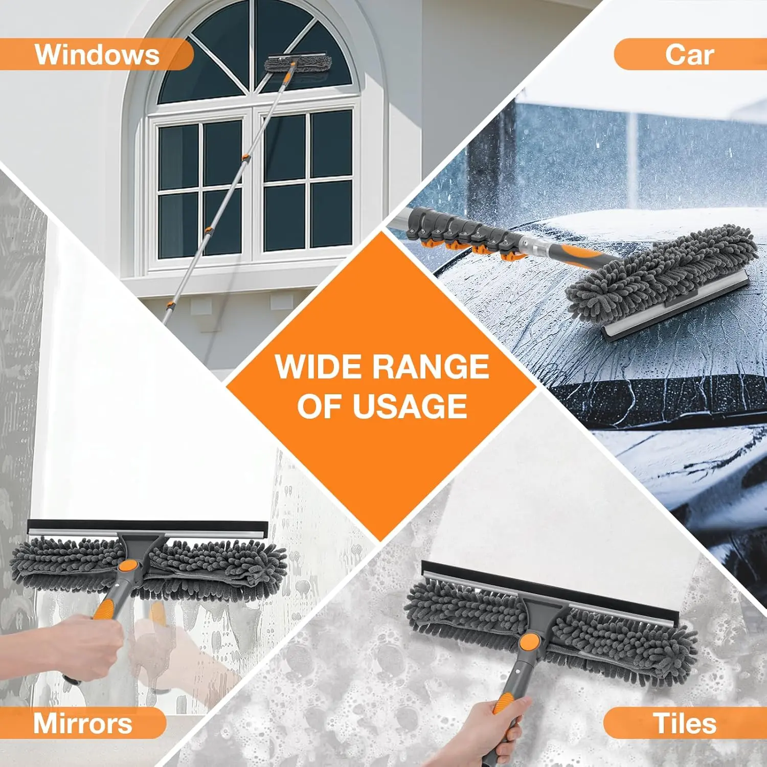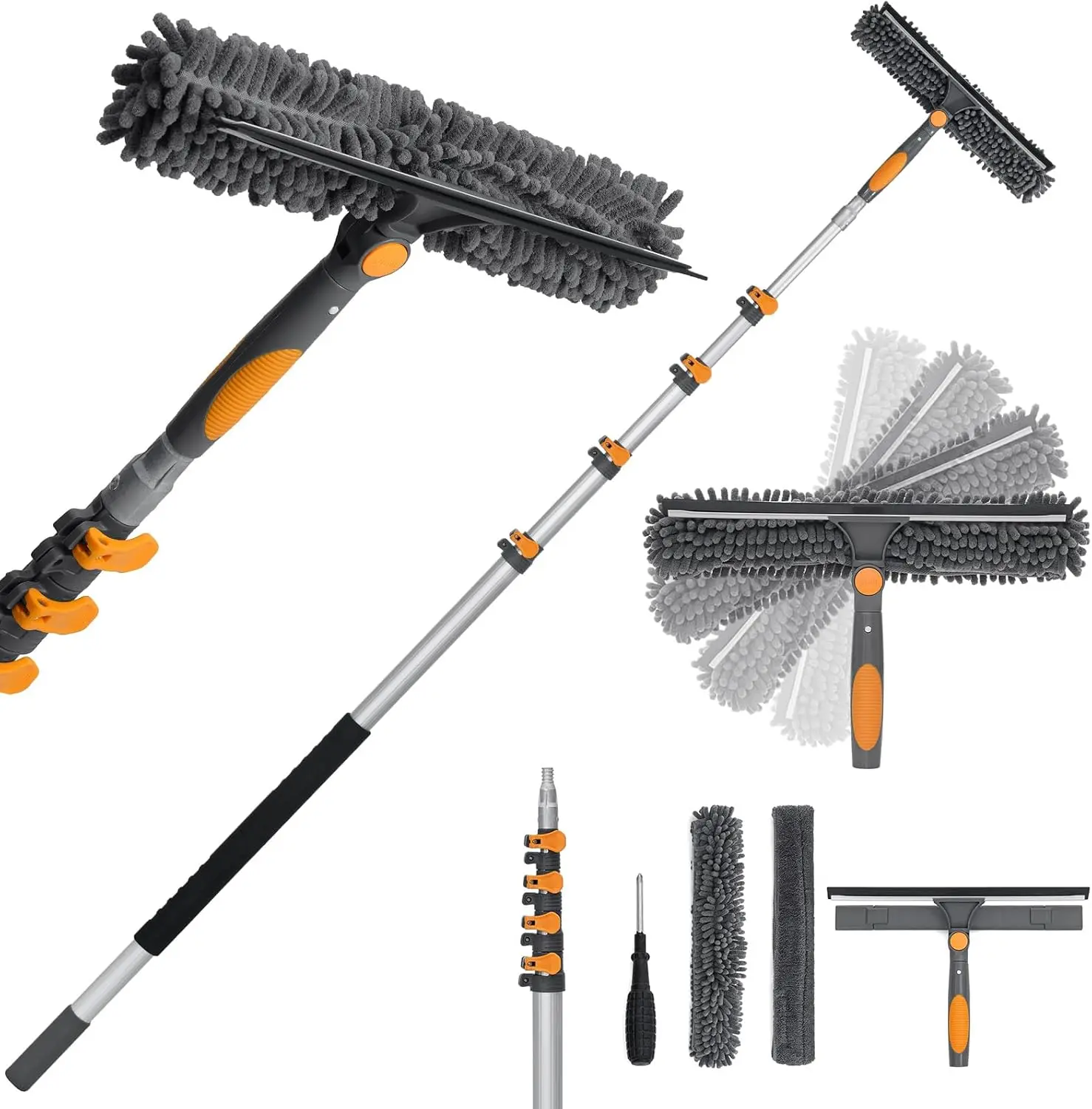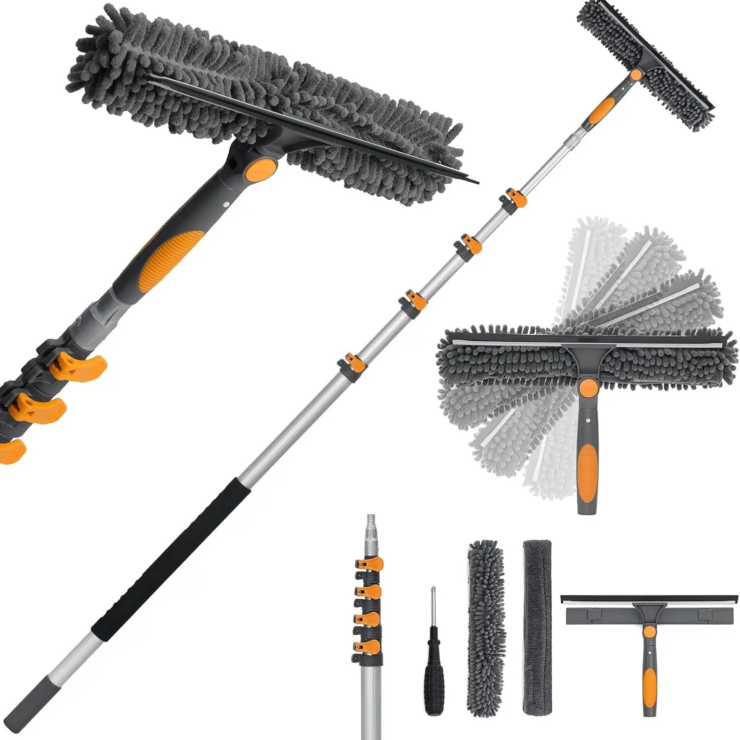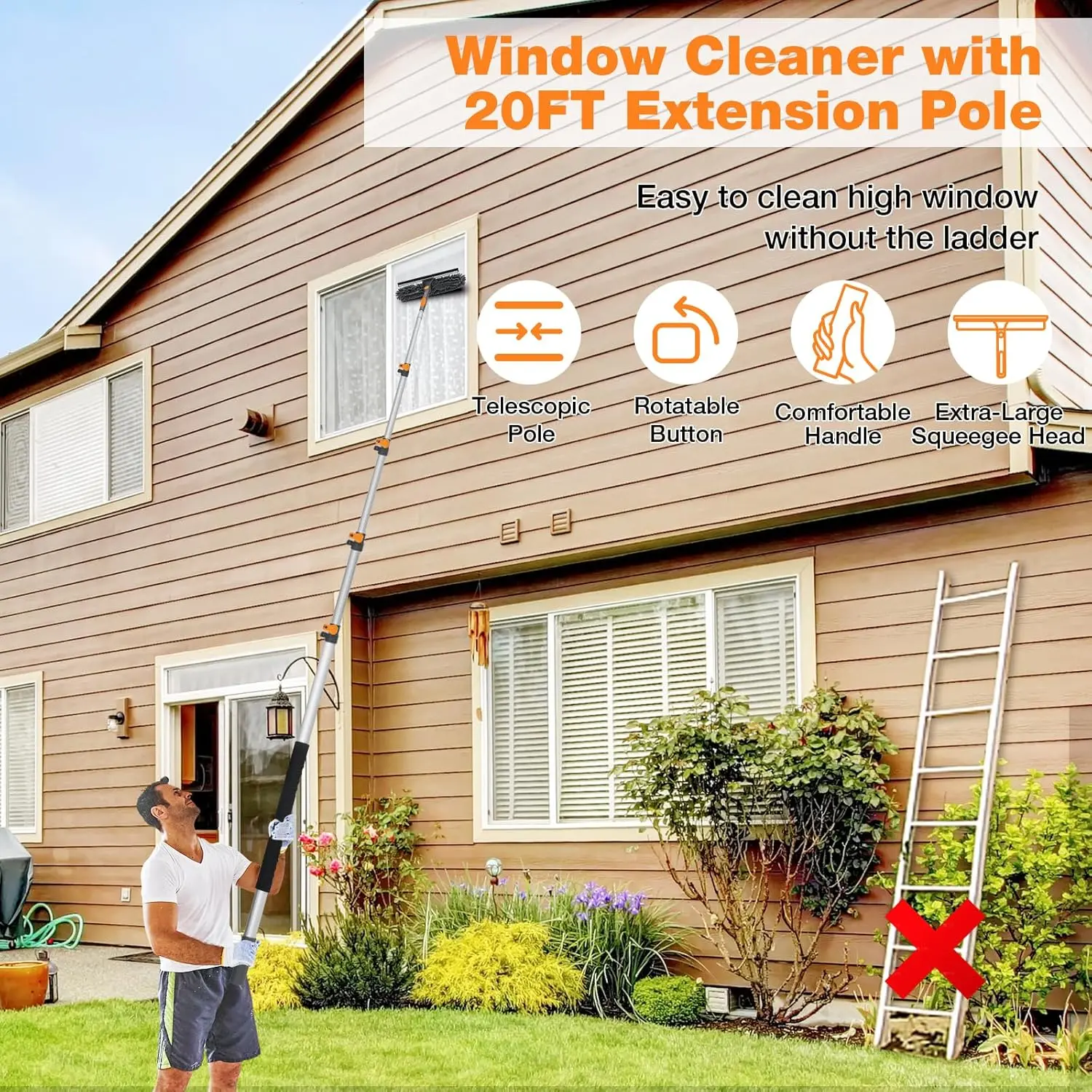 Adjustable Window Squeegee with 5-20ft Telescopic Pole 14" Oversized Head 2-in-1 Cleaning Kit for High Windows Glass RV Orange