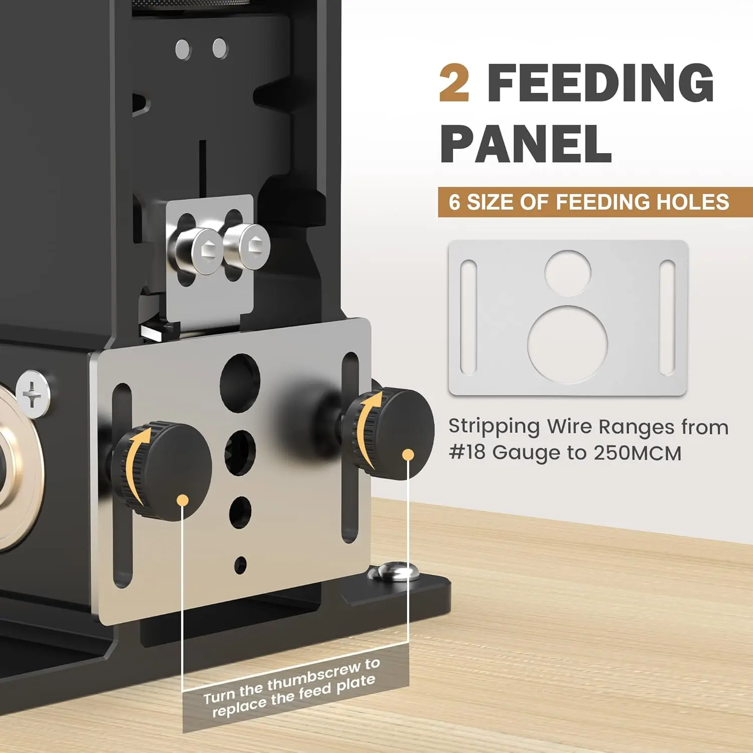 Wide Compatibility: This wire stripper comes with two interchangeable feed plates and six feed holes, allowing it to handle a wide range of wire sizes—from #18 to 250 —making it suitable for various stripping tasks.