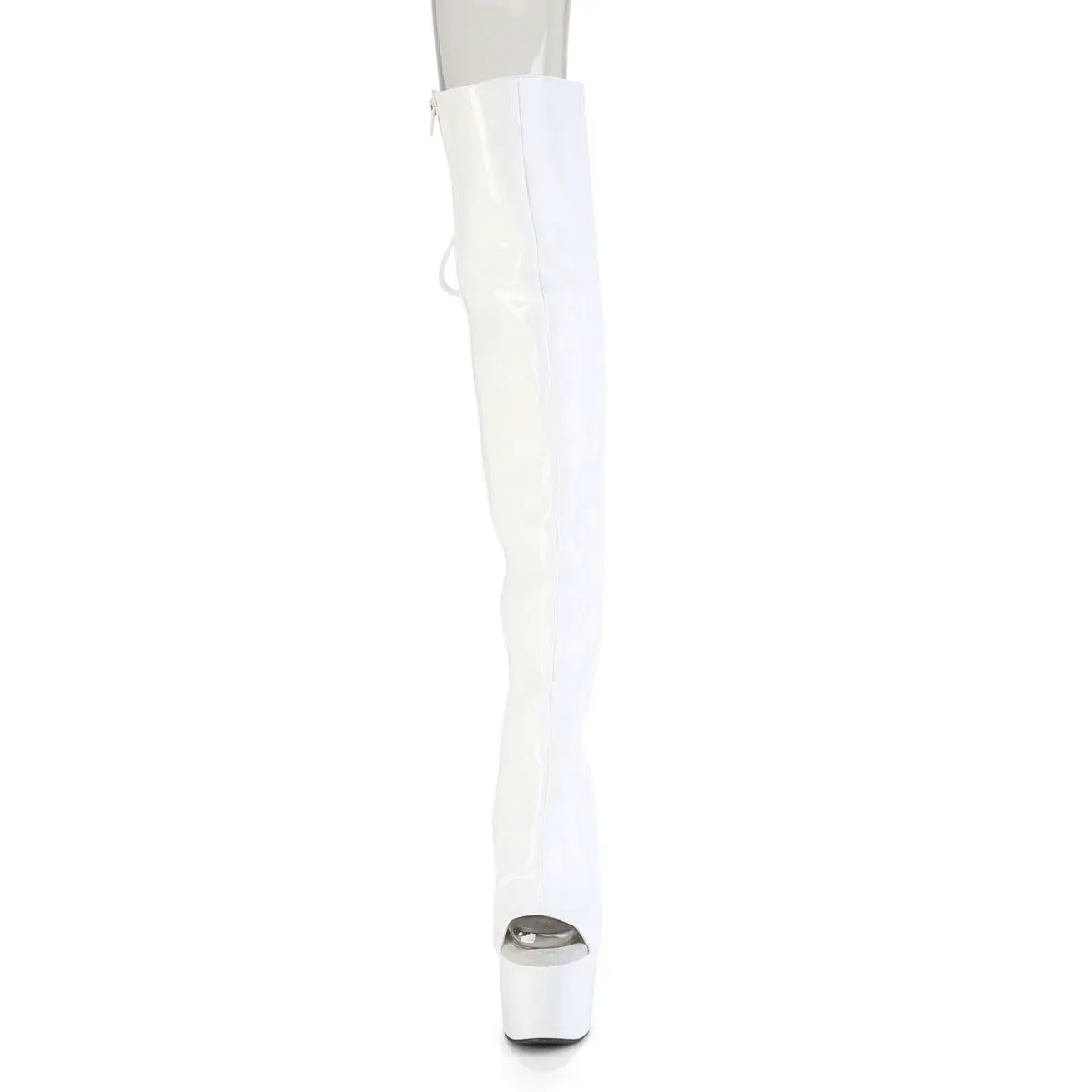 The Adore-3019HWR Boots are your ticket to capturing the spotlight. With a dramatic 7-inch heel and a 2 3/4-inch platform, these over-the-knee boots feature an open toe and heel to add a bit of allure to your look. Wrapped in a white stretch holo material, they reflect a spectacular sheen, making them perfect for those who dare to dazzle. A full-length inner side zip rounds out these eye-catching boots designed for memorable appearances.