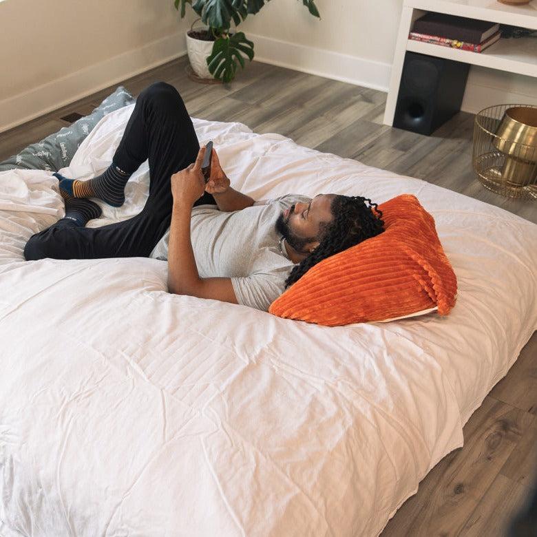 We've all been there before. You open your door to find long-lost friends or family on your doorstep, and suddenly you're scrambling to find a place for them to sleep. Or you're trying to take a nap in your living room, but the couch is just too uncomfortable. With our NEST chair, you'll never have to worry about being unprepared again. Just remove the cover to reveal an eco-friendly shredded polyfoam bed, and you're ready to host last-minute overnight guests and friends. If you already have a Classic Chair, you can turn it into a NEST by purchasing a NEST cover in the corresponding size available in our Extra Covers section!