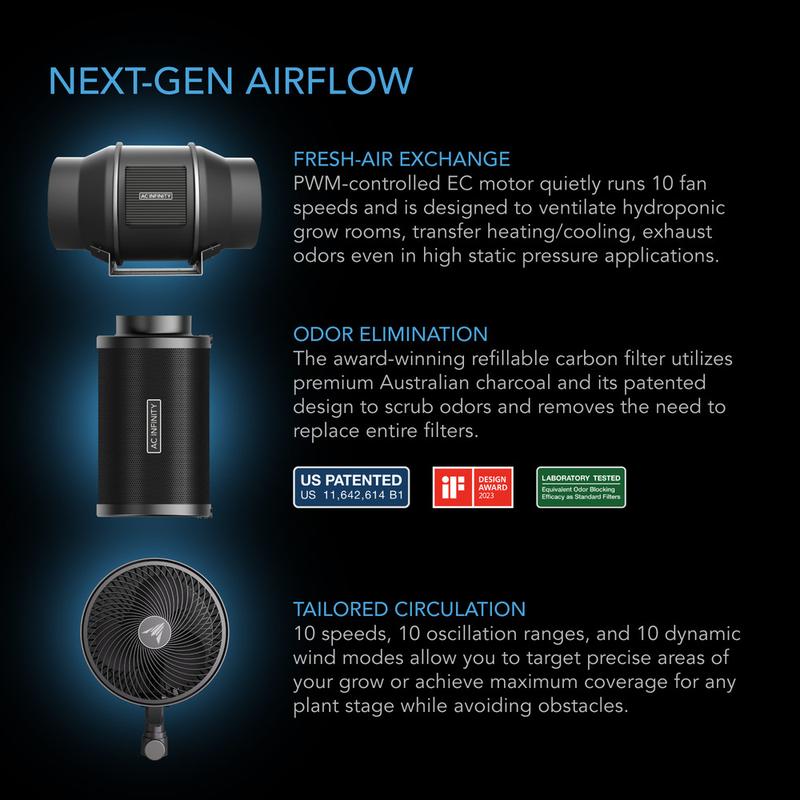 Introducing the upgraded AI-powered grow tent system—engineered with a cutting-edge intelligent controller that autonomously manages your grow environment for peak performance and maximum yields. This next-generation system uses smart sensors and algorithms to dynamically maintain ideal temperature, humidity, and airflow, taking the guesswork out of indoor growing. The inline fan, refillable carbon filter, and ducting system work seamlessly to regulate climate conditions, actively removing excess heat, humidity, and odors. Our eco-friendly carbon filter features a patented reusable design—no more replacing the entire unit, just refresh and reuse. Airflow is fine-tuned with a re-engineered oscillating clip fan, built with range control to deliver custom, targeted circulation that adapts to your plant’s needs over time. At the heart of the system is a powerful LED grow light built with algorithmically arranged LM301H EVO diodes—Samsung’s most advanced technology—providing superior light output, higher efficiency, and broader coverage than LM301H, LM301B, Bridgelux 3030, and other standard LEDs. All components are enclosed within an advanced high-density Oxford grow tent, reinforced with a durable steel frame, lab-tested reflective Mylar interior to create a stable climate-controlled growing environment featuring a large window to view your grow without disruption. With the power of AI now integrated, this grow tent system doesn't just support your grow—it thinks ahead for it.