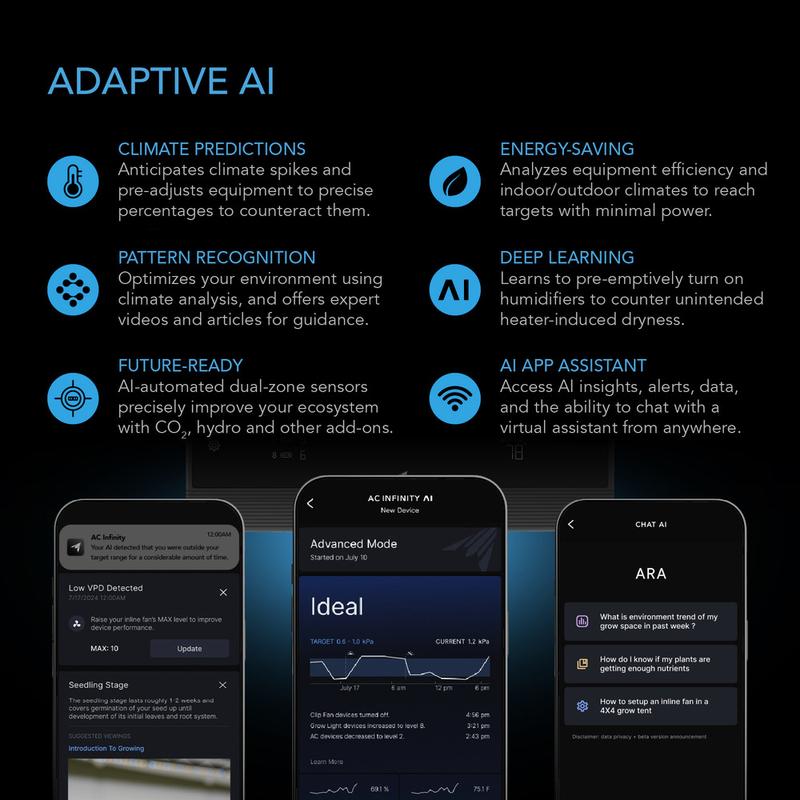 The CONTROLLER AI+ observes your grow space, pairing with the inline fan, clip fan, and LED grow light, and makes environmental adjustments to ensure its stability. Going beyond on/off triggering and timer programming, it is always learning, analyzing previous results to avoid over- or undershooting output levels and better optimize your climate. Connect this controller to the AC Infinity app to select between two AI modes that adjust automatically or fine-tuned control for greater customization. You can also get access to helpful grow guides, recipes, articles, video tutorials, and chatbot assistance that will equip you with the knowledge to improve how you grow.