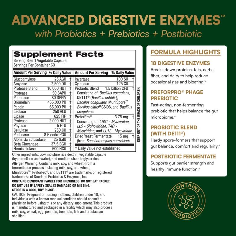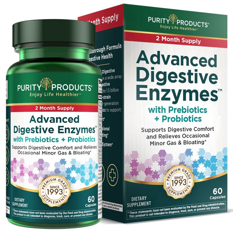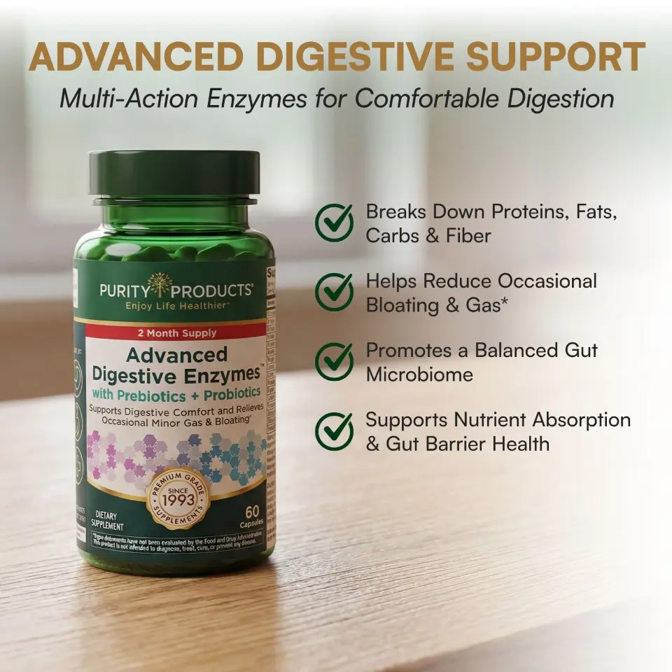 Purity’s Advanced Digestive Enzymes delivers comprehensive support for digestive comfort, gut health, and nutrient absorption—powered by plant-based enzymes, probiotics, and the clinically studied prebiotic PreforPro. Designed to help relieve occasional minor gas, bloating, and digestive discomfort, this formula brings together the essential elements your gut needs to thrive.