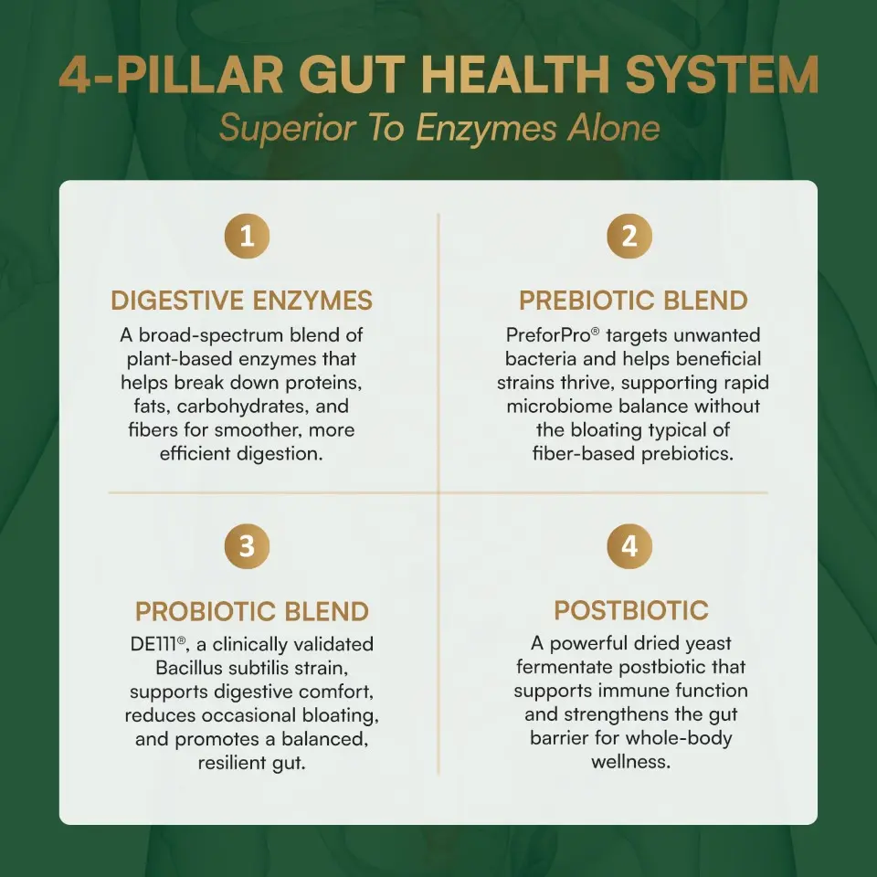 Each once-daily vegetarian capsule provides a comprehensive blend of 18 digestive enzymes to help your body efficiently break down proteins, fats, and carbohydrates. This broad-spectrum enzymatic support can ease occasional digestive strain, especially as natural enzyme production declines with age. Whether you're navigating heavy meals, food sensitivities, or everyday digestive concerns, this formula is designed to support comfort and regularity from the inside out.