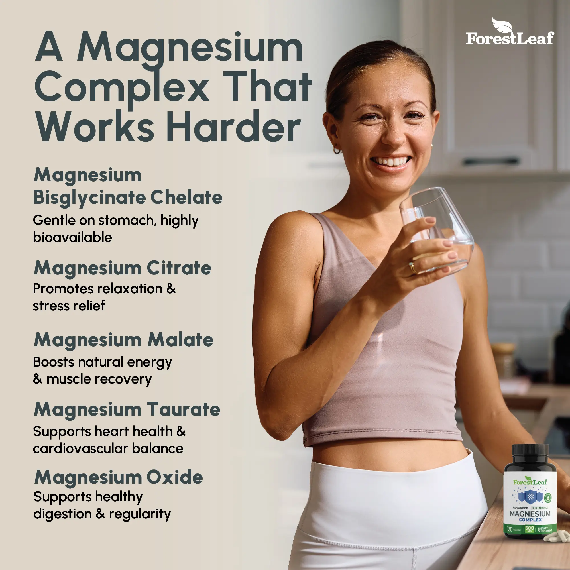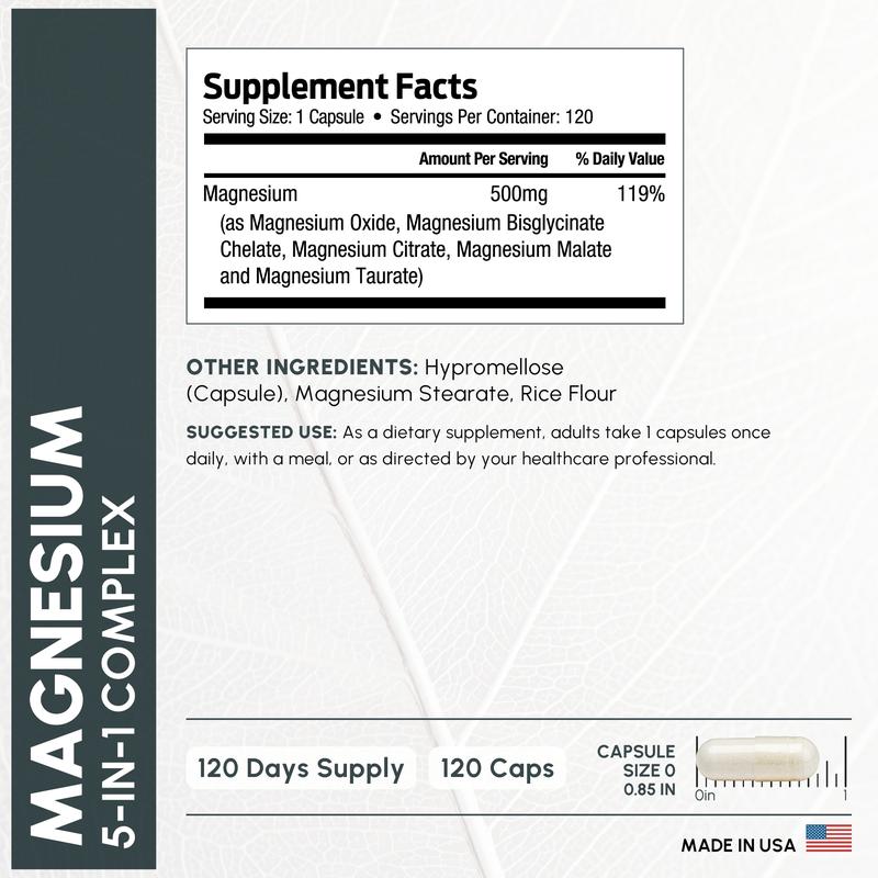 ·ADVANCED MAGNESIUM COMPLEX 500MG - Get more out of your magnesium complex supplement with an advanced blend of Magnesium Taurate, Magnesium Glycinate, Magnesium Malate, Magnesium Citrate, and Magnesium Oxide providing magnesium 500mg per serving.