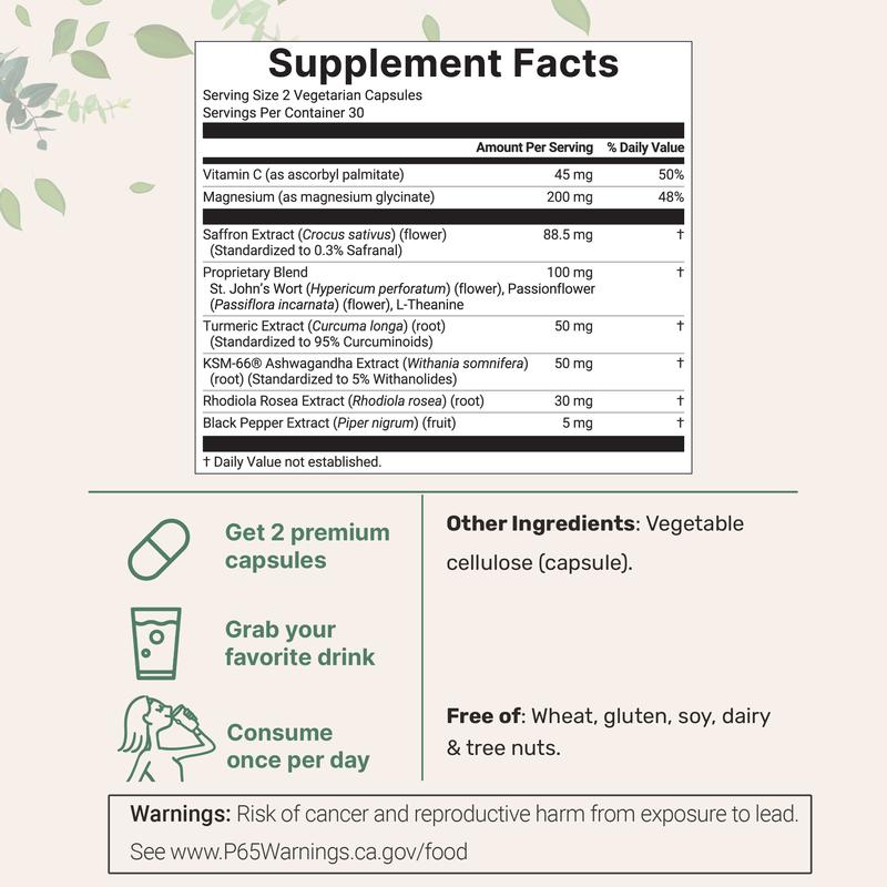 ·Each bottle includes 60 veggie capsules for a 30-day supply, delivering saffron along with fat-soluble vitamin C, magnesium glycinate, St. John’s Wort, passionflower, L-theanine, 95% turmeric extract, KSM-66 ashwagandha, rhodiola rosea, and black pepper for maximum absorption.