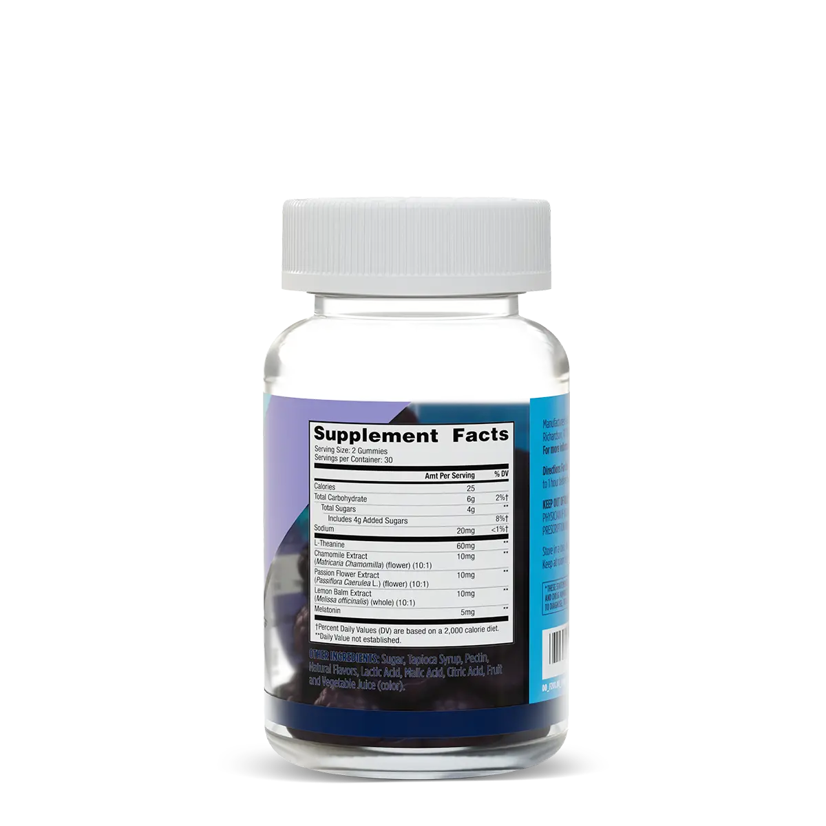 IngredientsL-Theanine, Chamomile Extract (Matricaria Chamomilla) (flower), Passionflower Extract (Passiflora CaeruleaL.) (flower), Lemon Balm Extract (Melissa officinalis) (whole), Melatonin.\ Other Ingredients: \ Sugar, Tapioca Syrup, Pectin, Natural Flavors, Lactic Acid, Malic Acid, Citric Acid, Fruit and Vegetable Juice (color)