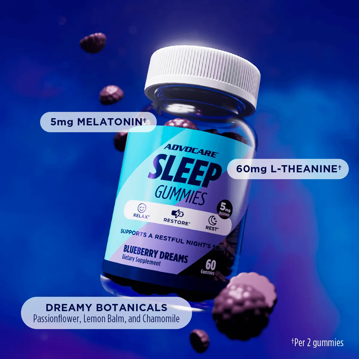 AdvoCare® Sleep Gummies deliver 5mg of melatonin and 60mg of L-theanine to quiet racing thoughts and promote relaxation. A soothing blend of passionflower, lemon balm and chamomile helps set the mood for sleep naturally. With a tasty blueberry flavor and no next-day grogginess, these gummies make it easy to look forward to bedtime.It's perfect for night owls, late shift workers and people adjusting to inconsistent schedules. A higher melatonin dose helps you fall asleep faster and L-theanine promotes calm without drowsiness.