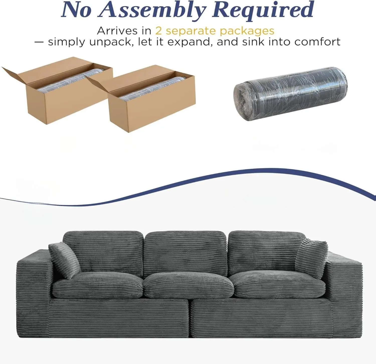 ·No Assembly Required: The compressed no bones sofa arrives in two boxes and requires no assembly. Simply unbox, allow the sofa to expand, and wait 48-72 hours before use. Note: The two boxes may not arrive at the same time. 📦