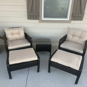 The 5-piece set includes: 2 chairs (26.3"L x 28"W x 29"H), 2 ottomans (26.3"L x 20"W x 15.7"H), and 1 coffee table (18"L x 18"W x 16.5"H). Perfect for patios, gardens, porches, balconies, and poolside areas. Measure your space before purchasing. 🏡