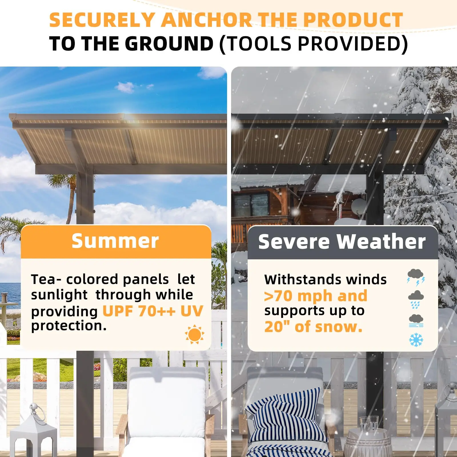 ·Unrivaled >7” Snow Load: Engineered to excel in extreme climates, our gazebo’s unsupported side has undergone a full year of rigorous testing, proving its ability to withstand pressures of 10 lbs/sq.ft without structural compromise. Whether facing relentless snowfall or torrential downpours, it remains resolute—ensuring year-round reliability in even the harshest environments.