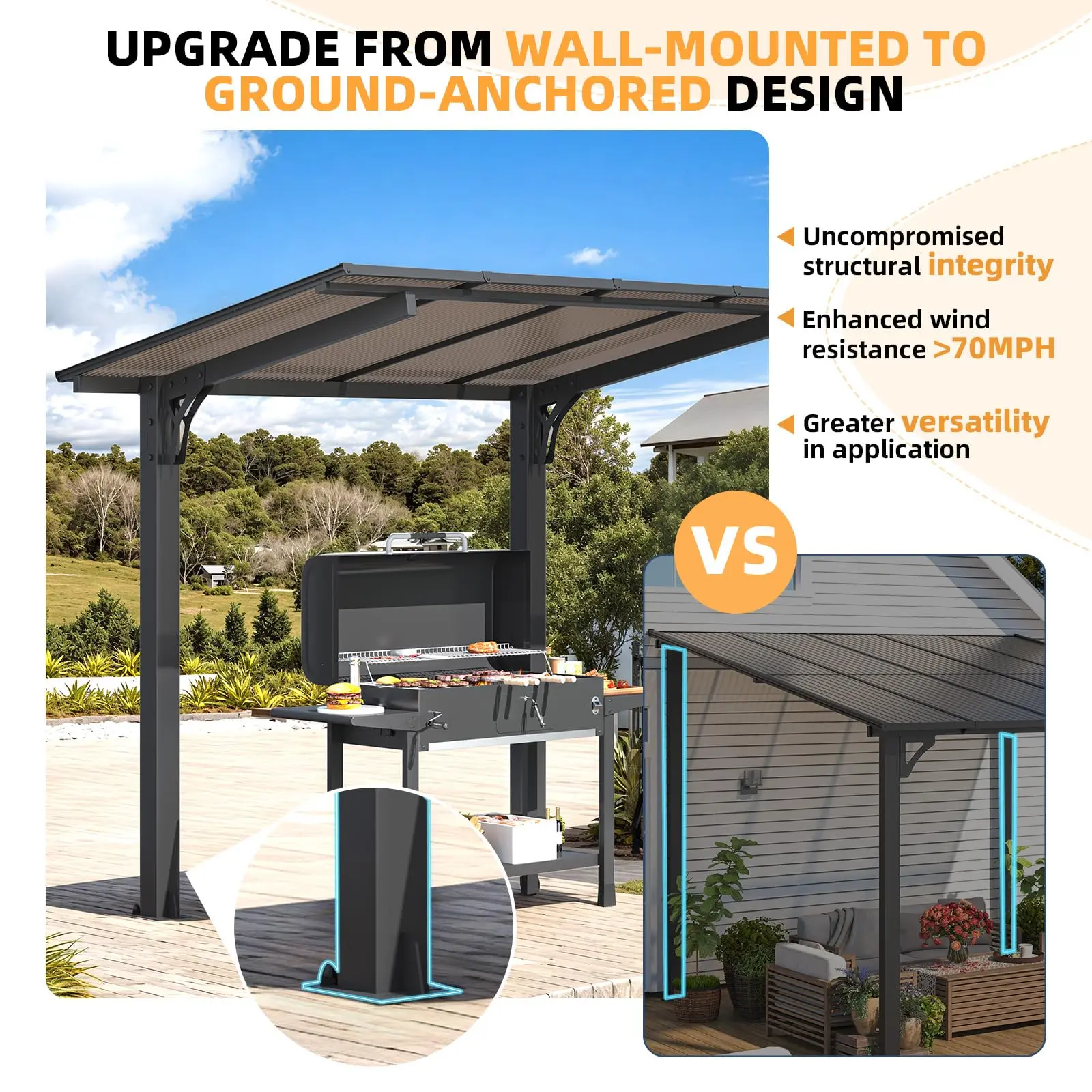 ·Distinguished Craftsmanship: Designed for both elegance and resilience, our freestanding lean-to gazebo anchors securely to the ground with robust stakes, allowing effortless placement in any corner of your patio. Unlike traditional wall-mounted gazebos, it provides steadfast support without compromising your walls, offering an impeccable balance of form and function.