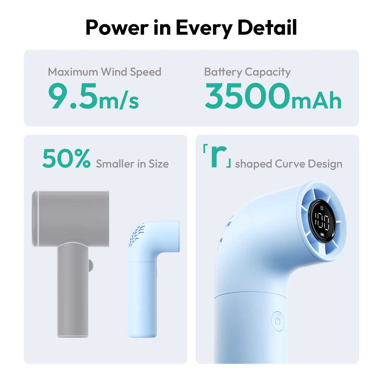 The fan blows a lot of air. And the battery doesn't die quickly.