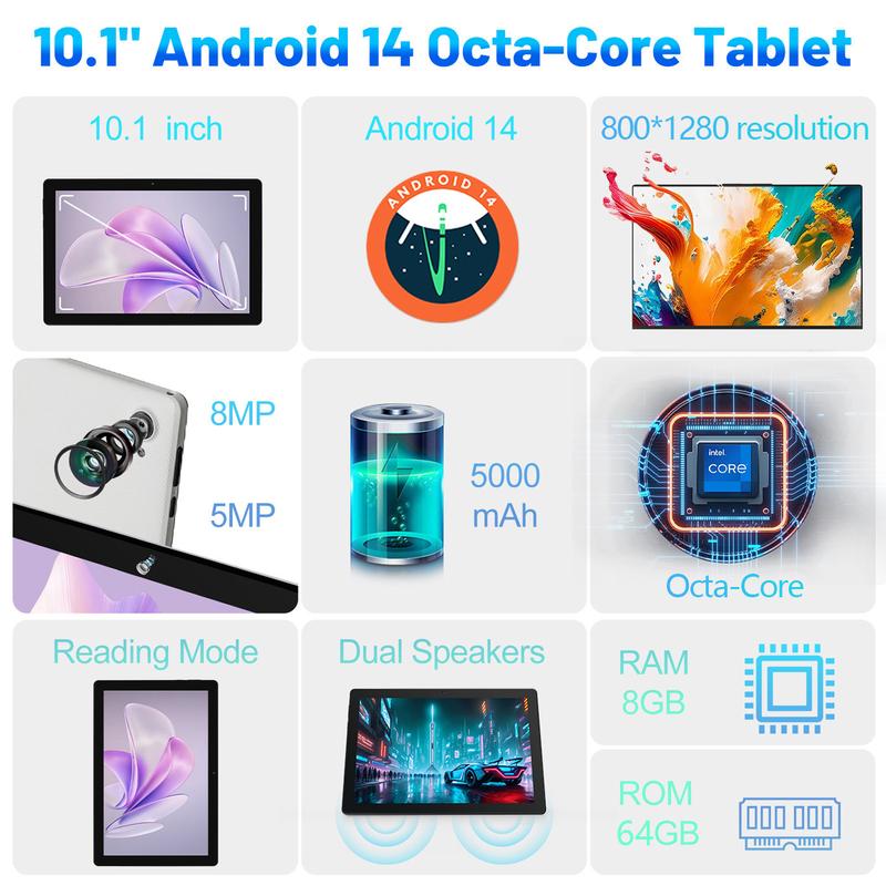 【Android 14 Tablet】10.1 inch tablet, Android 14, the latest operating system, improves privacy and security with personalization features for smoother, faster operations.