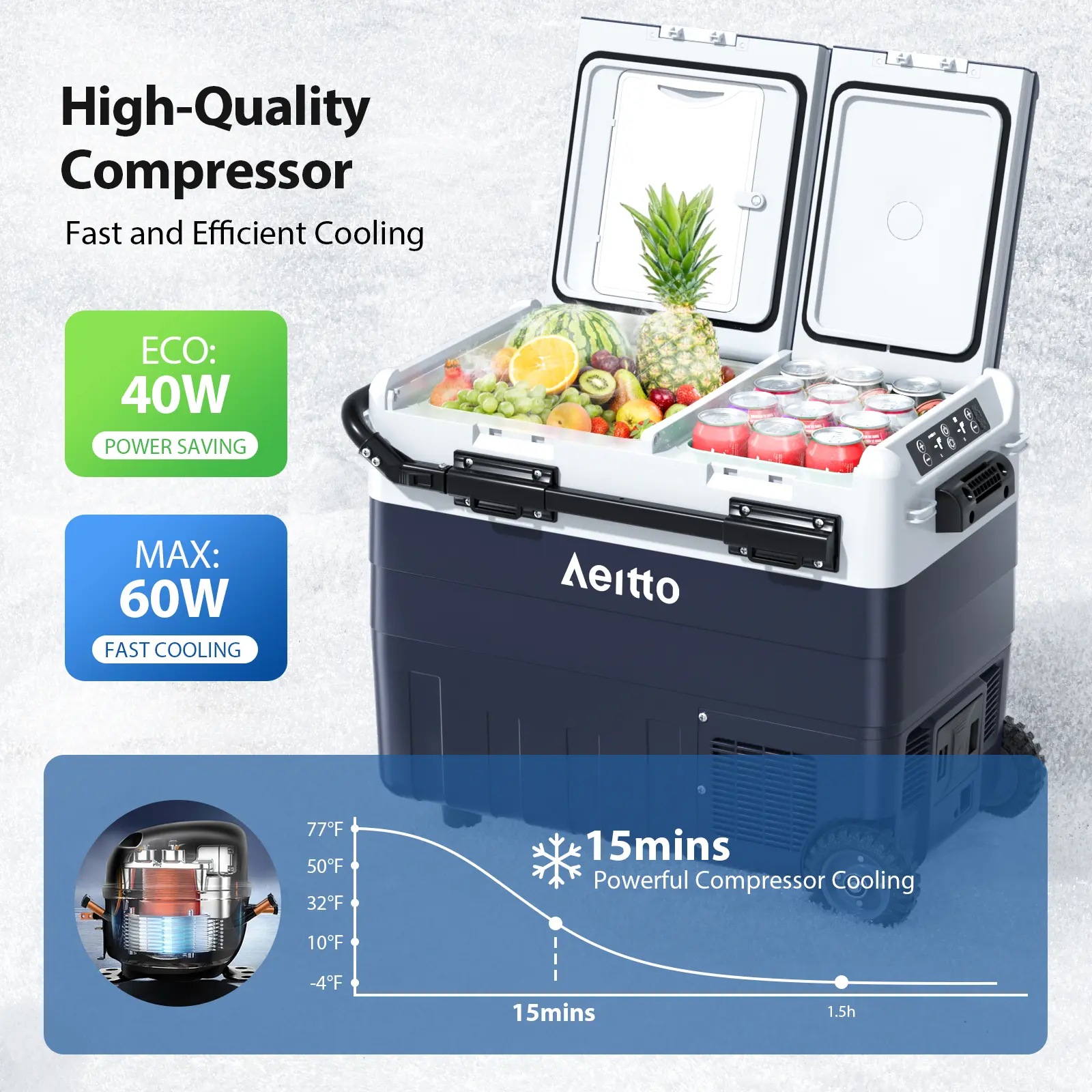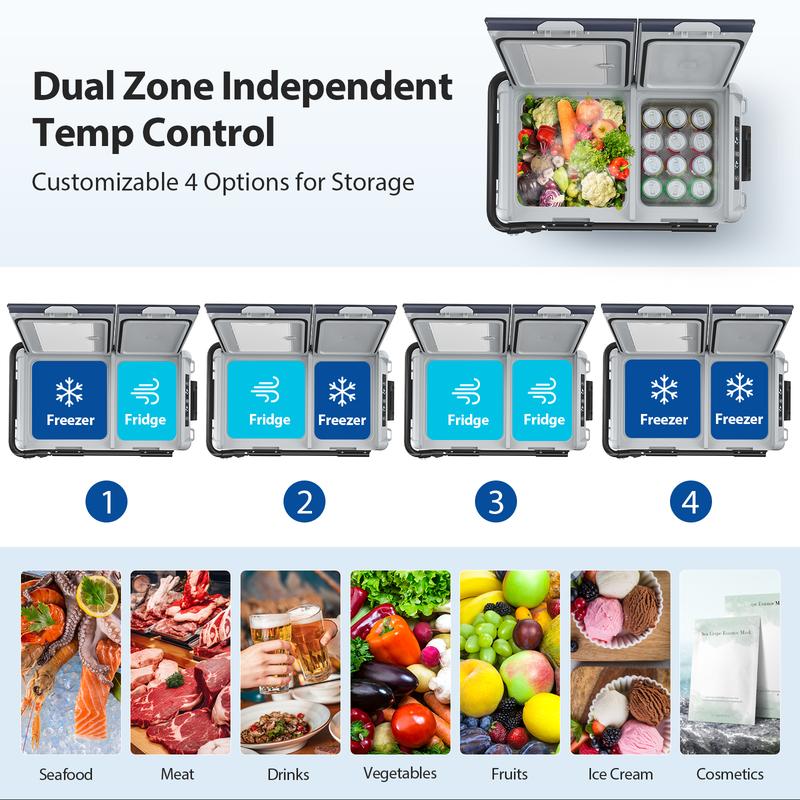 ·Dual Zone Temp Control: The Aeitto 12 Volt Car Refrigerator features dual zone independent temperature control, it can be used as both a freezer and a cooler, or one as a freezer and the other as a cooler. With a cooling range of -4 °F to 68 °F (-20 °C to 20 °C), it can fulfill all your freezing and chilling needs. The dual-zone feature provides optimal storage flexibility, ensuring that different types of food, beverages and pharmaceuticals are kept at the ideal temperature