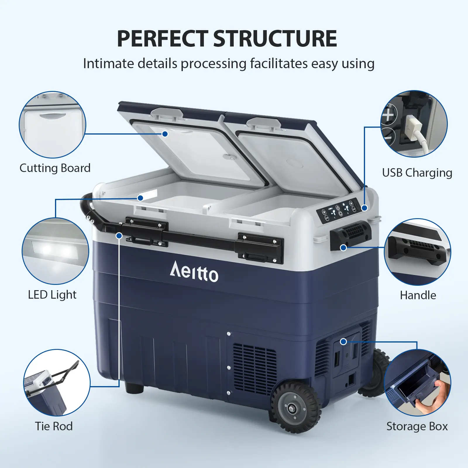 ·User-Friendly Design: The freezer is equipped with retractable tie rods, sturdy wheels, and the handles to make it easy to move around at the campground or on the beach. The built-in utility cutting board to handle ingredients conveniently at all times. Built-in LED lighting improves visibility. The USB charging port for charging phones or other electronic devices. The removable refrigerator door makes it easy to clean. You can also change the opening method according to your needs or habit