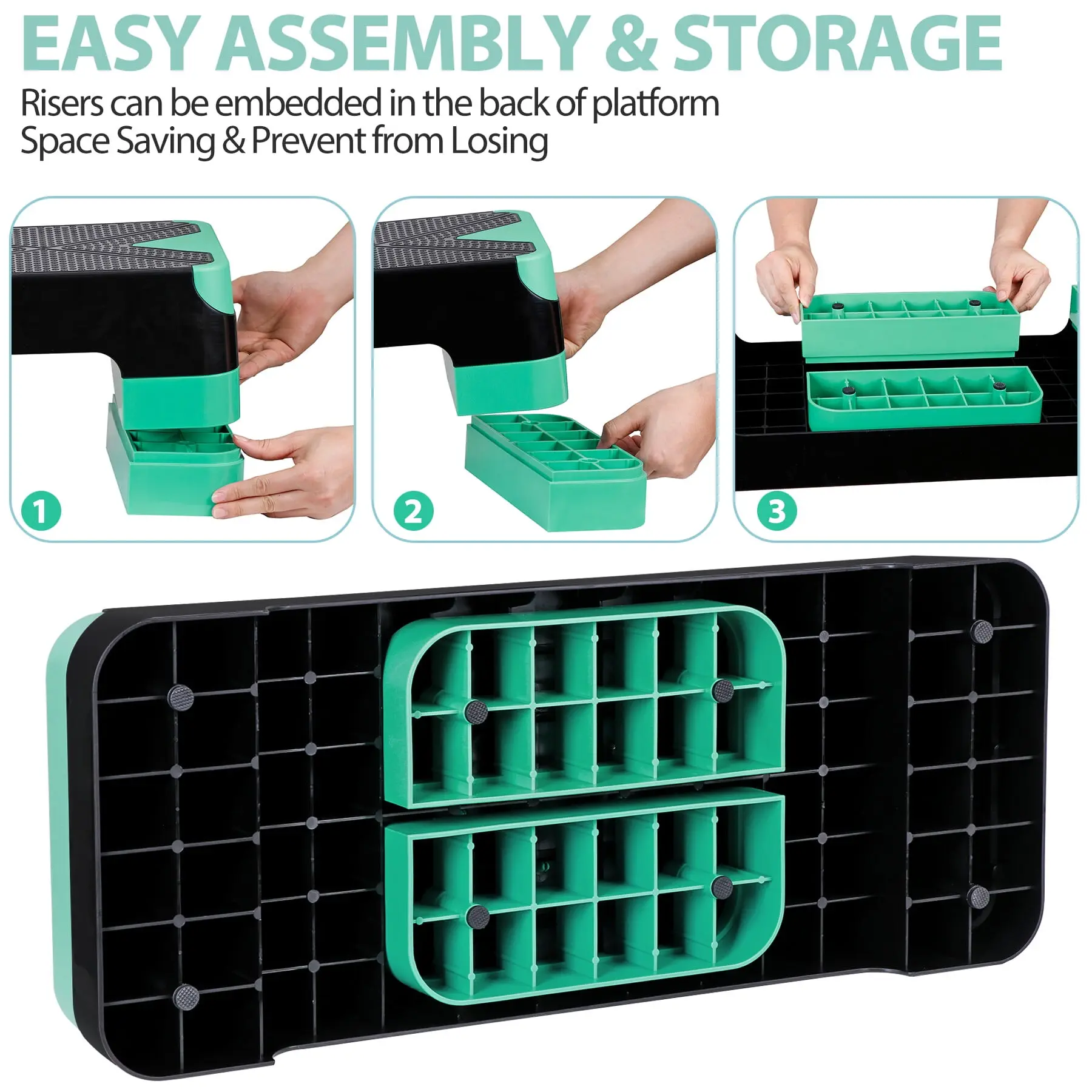 It features a non-slip shock-absorbing surface which is textured to enhance stability and security throughout the workouts, and comes with 4 nonskid feet on each riser to prevent it from sliding and scratching floors.