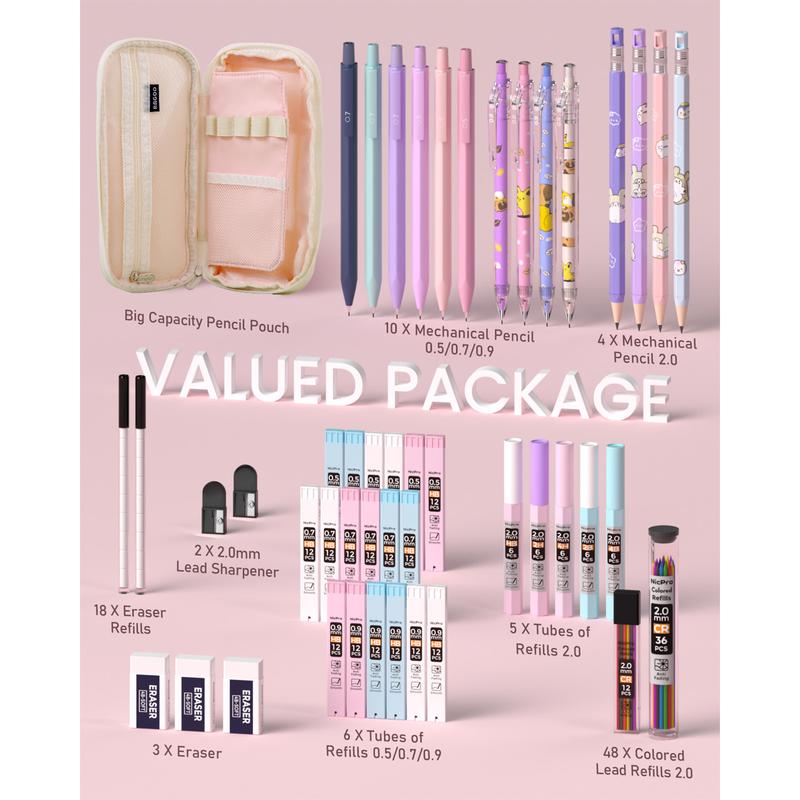 Upgrade your stationery with the Nicpro 47 Pack. This set includes cute pastel mechanical pencils in 0.5, 0.7, 0.9, & 2mm sizes. It comes with 25 tube lead refills in 4B, 2B, HB, and 2H colors. Perfect for students, this big capacity pen case also features erasers. 📏