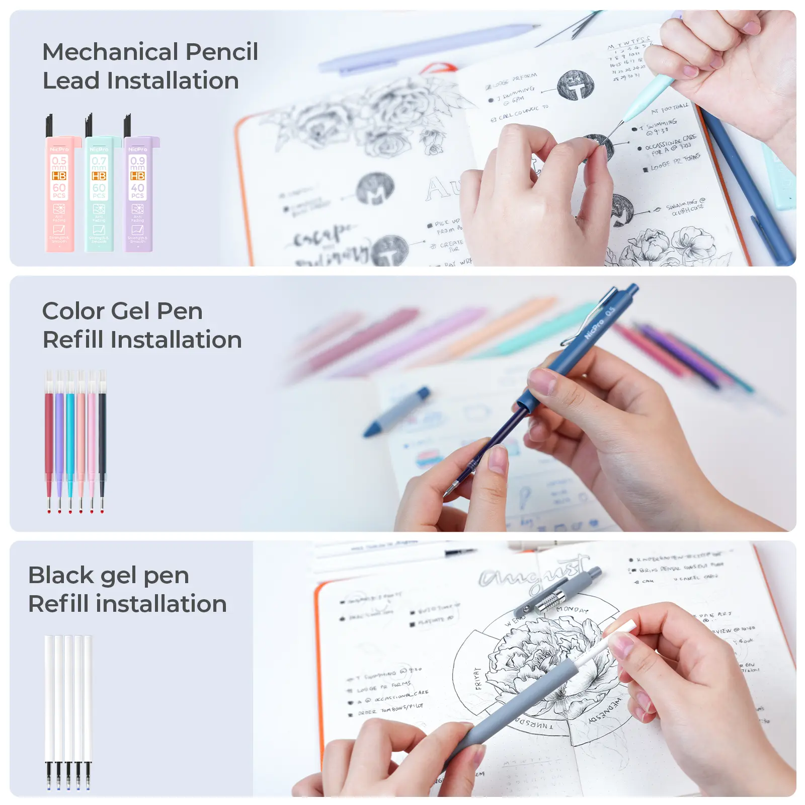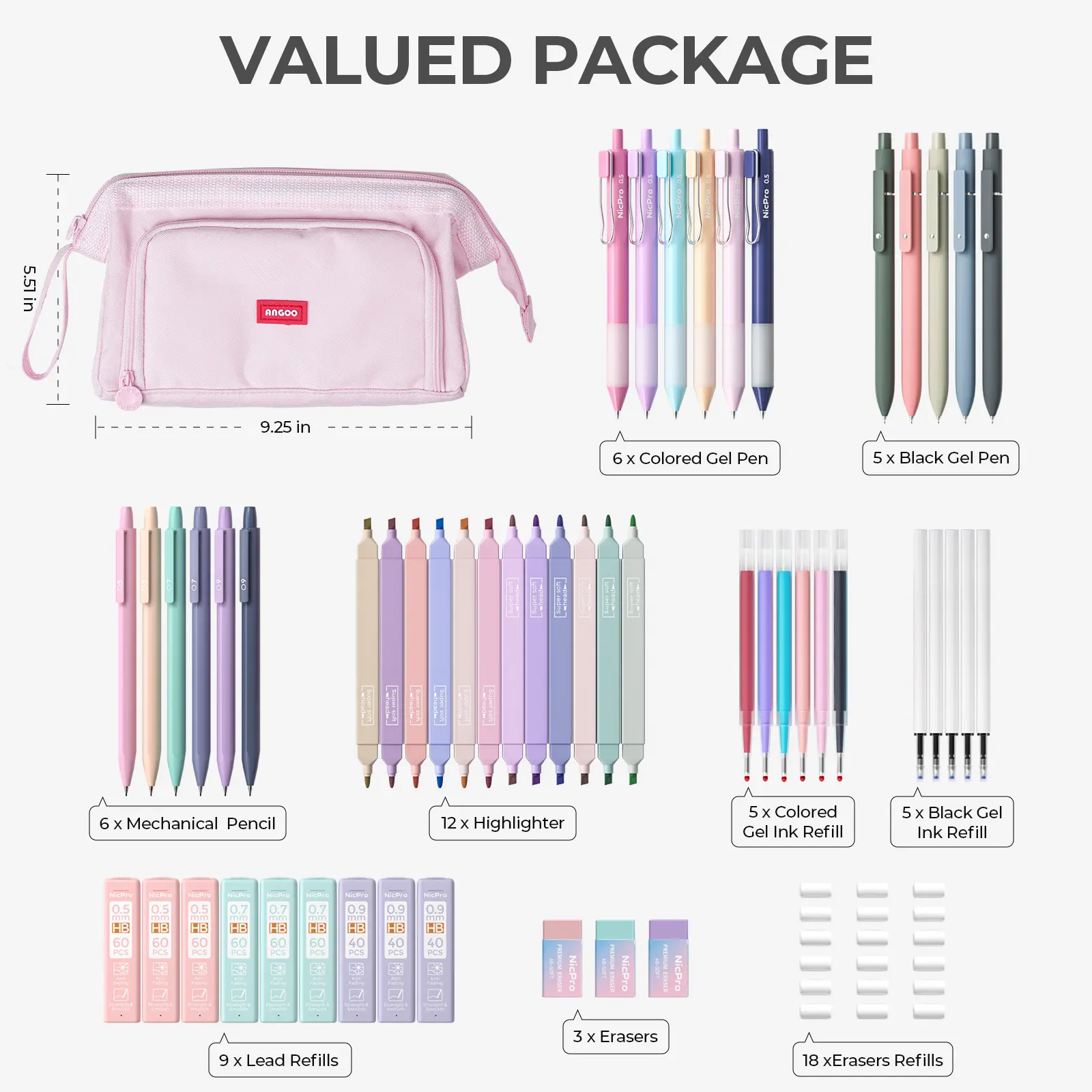 ·What's Included:12 pastel highlighters11 color & black ink gel pens6 mechanical pencilsCute pen case