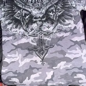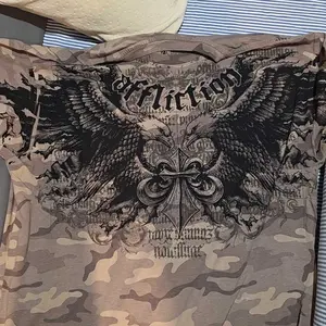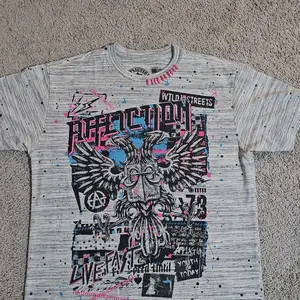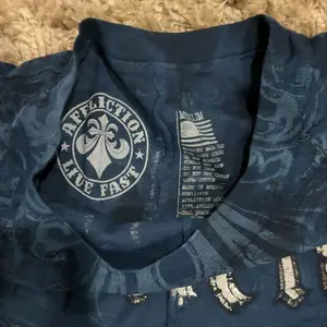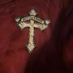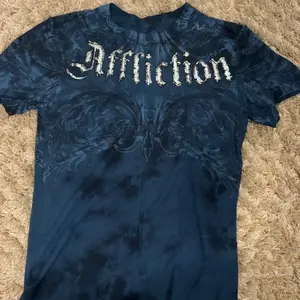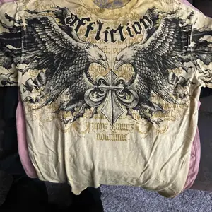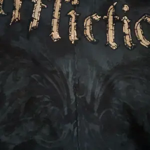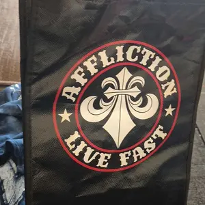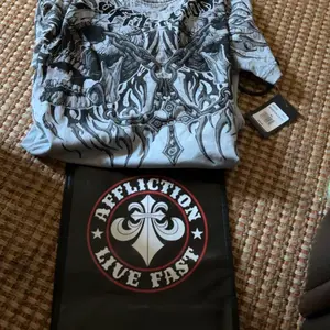 arrived within a week of purchase. seems to be legit affliction for those wondering. I got a haunted mound collaboration tee, and also the black night tee. order also came with complimentary stickers + small affliction bag and pin. tags show original shirt prices, too. 💯