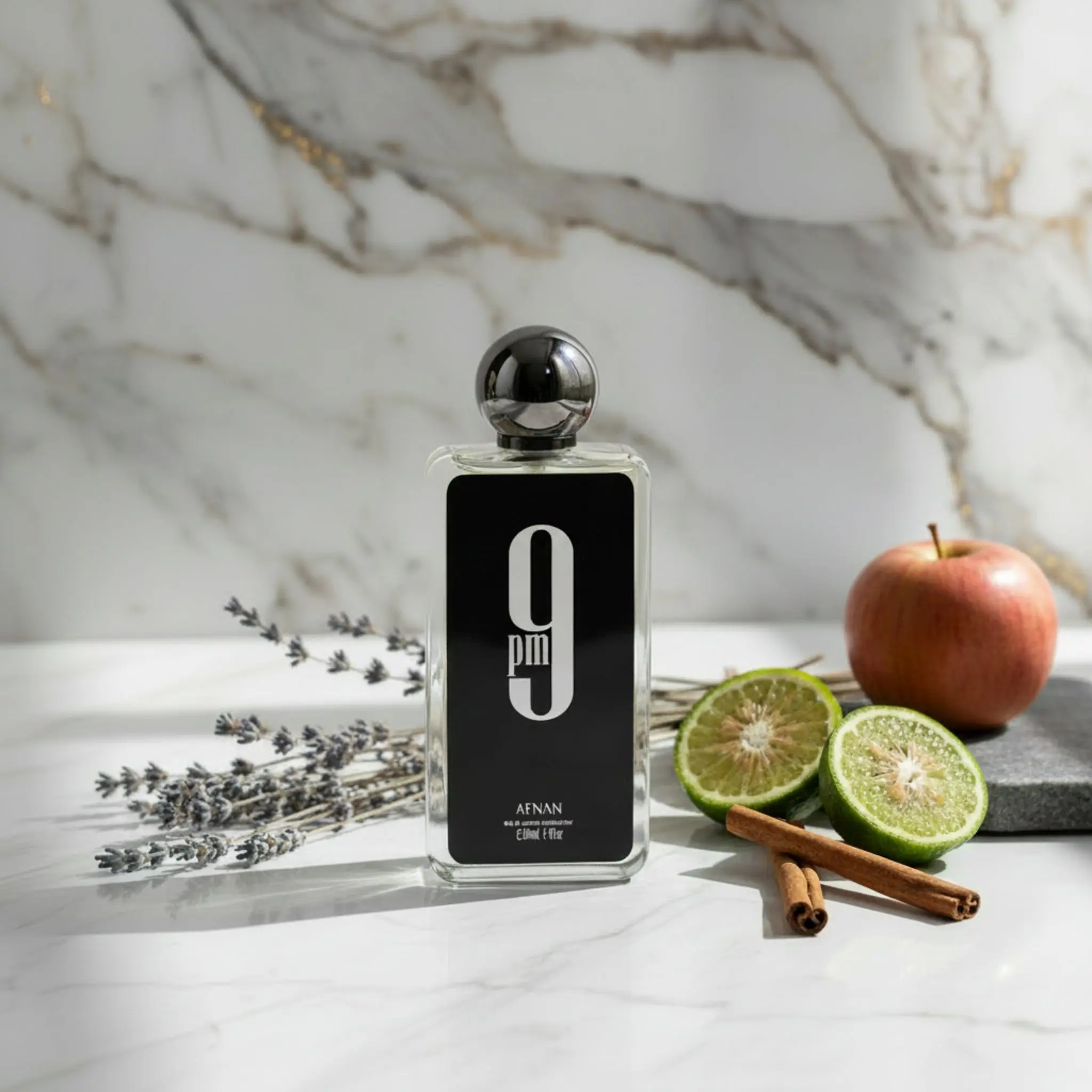 Introducing 9 PM by Afnan — a bold and refined men’s fragrance crafted for the evening, blending fresh curves of citrus and fruit with warm amber-vanilla undertones for memorable impact.