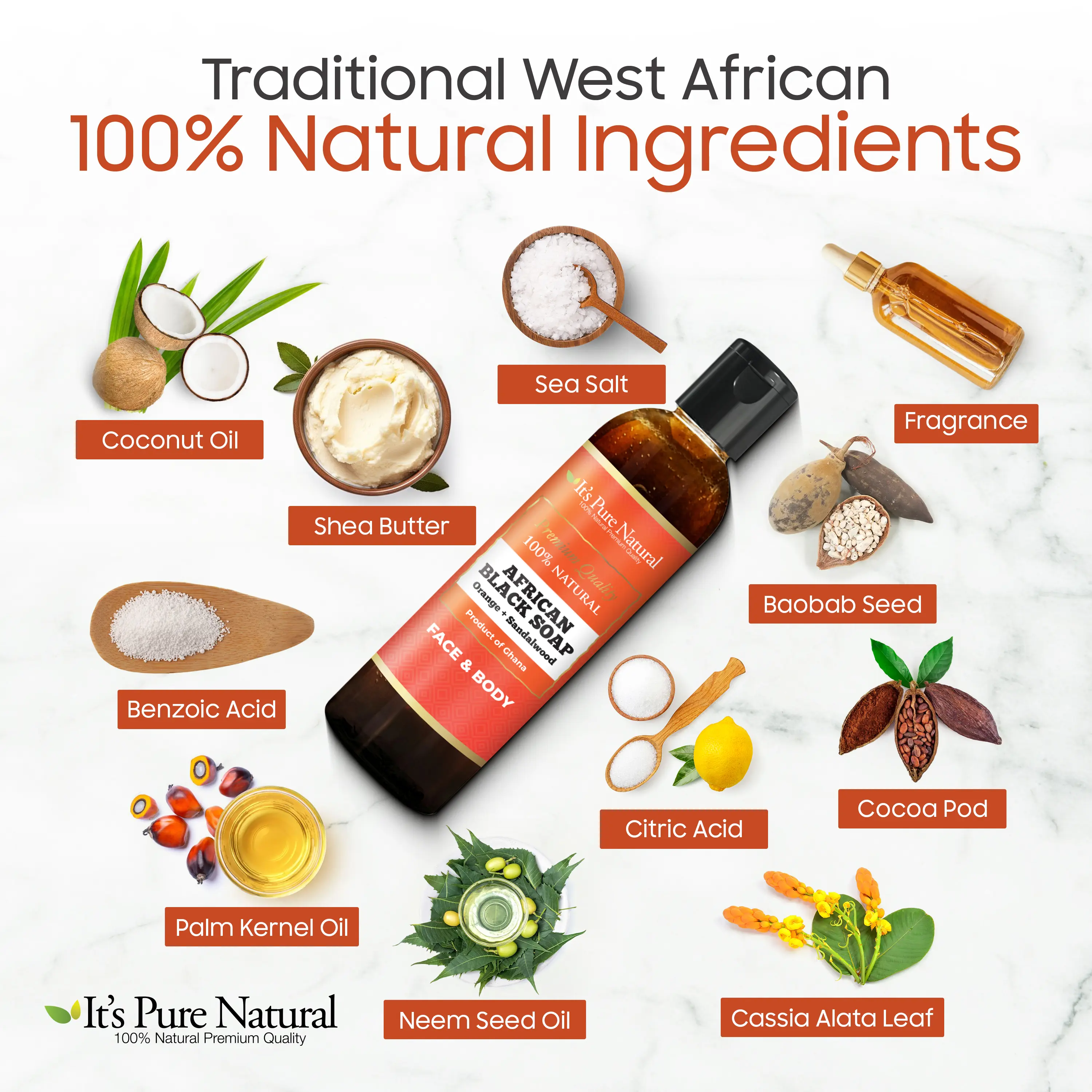 Coconut Oil, Sea Salt, Shea Butter, Fragrance, Benzoic Acid, Citric Acid, Cocoa Pod, Palm Kernel Oil, Neem Seed Oil, Cassia Alata Leaf