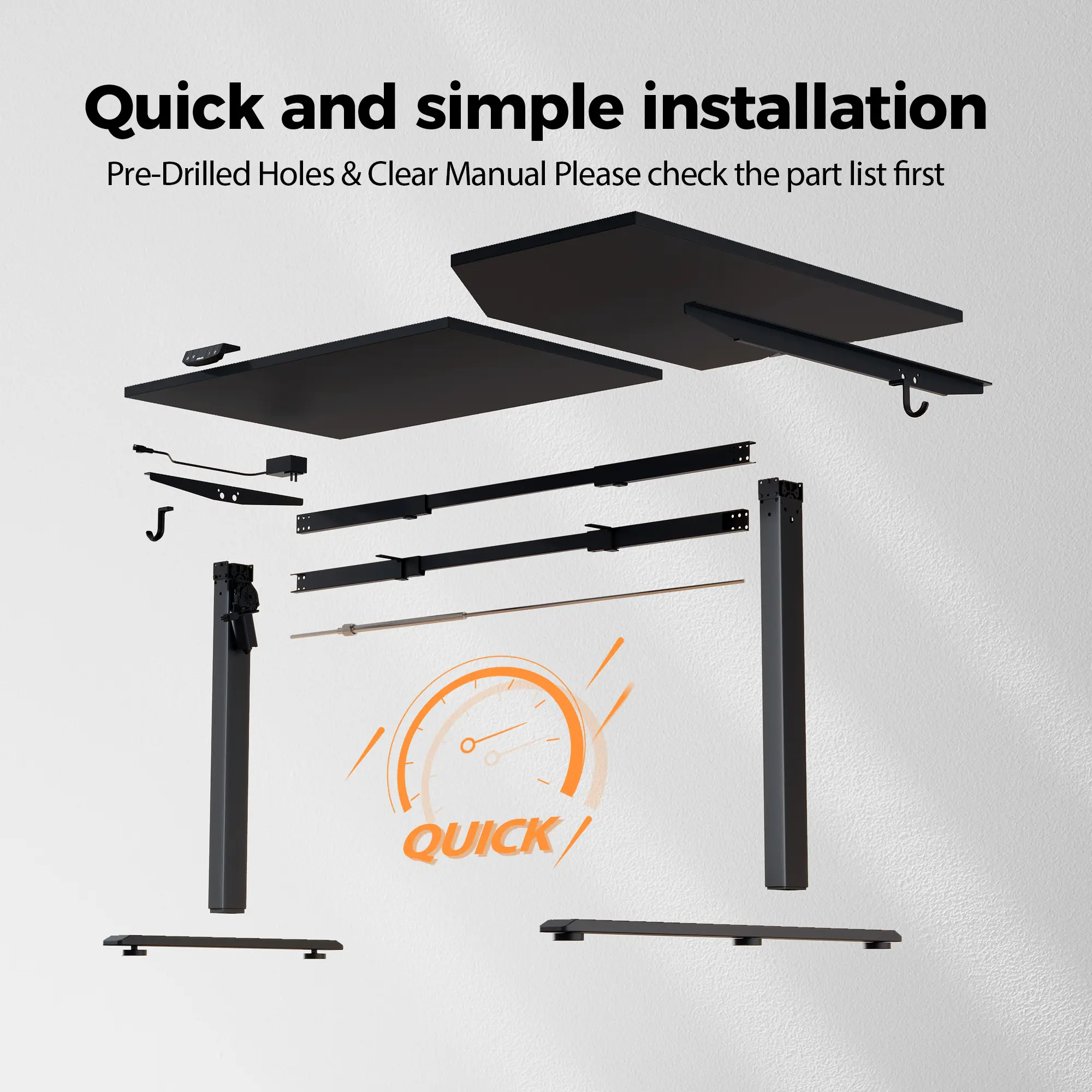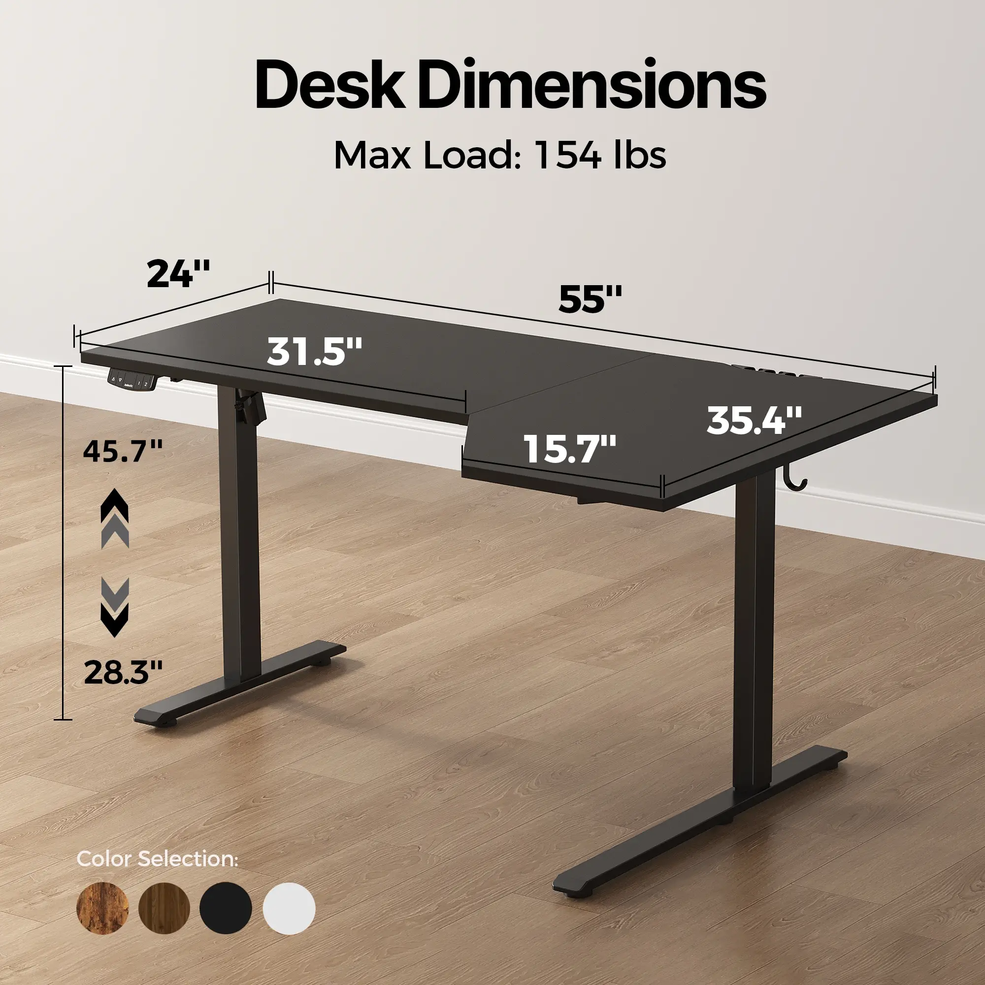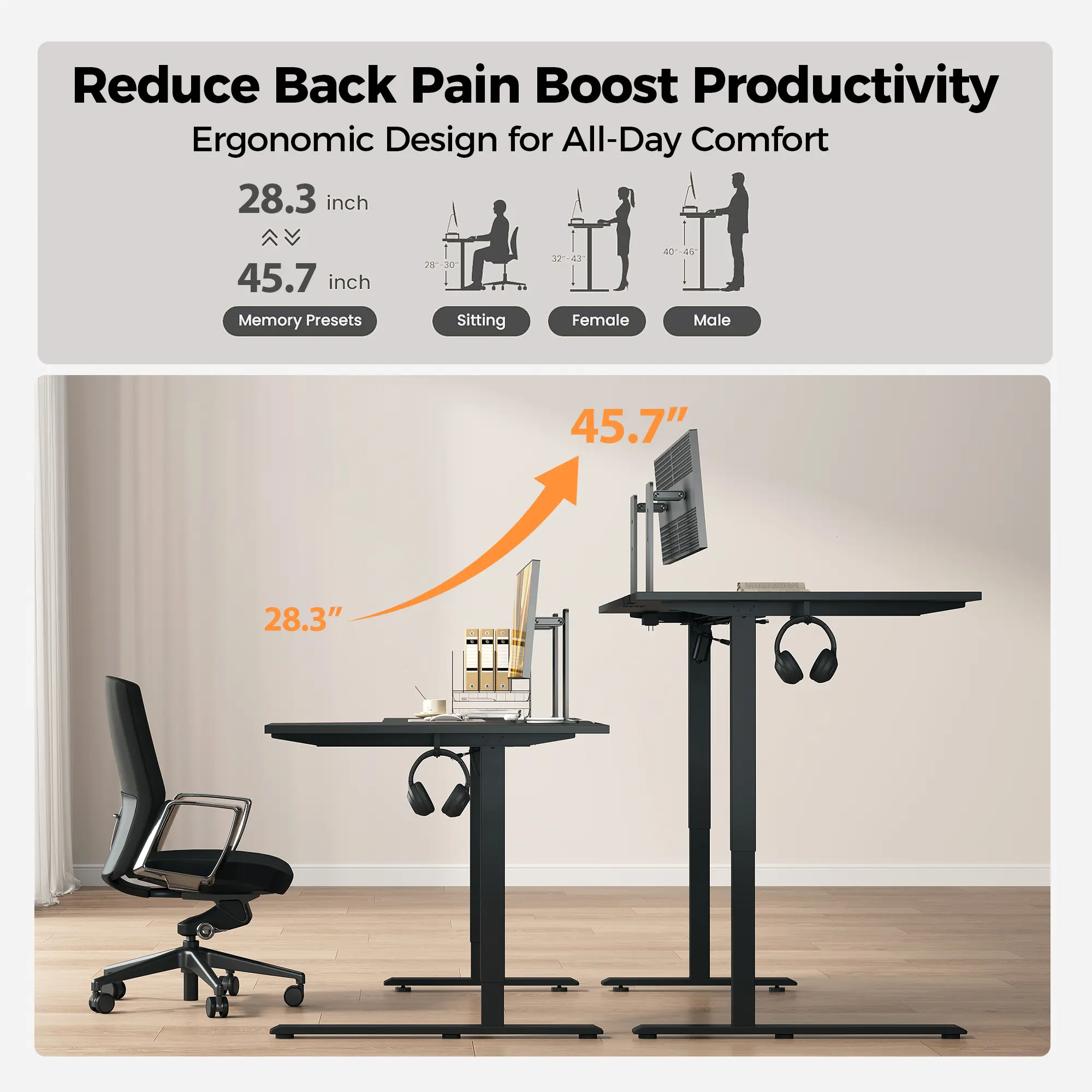 ·Smooth Electric Height AdjustmentEasily raise or lower the desk from 28.3'' to 45.7'' using a quiet motor that operates under 55 dB. Switch seamlessly between sitting and standing to support a more flexible and comfortable work routine. Two memory presets let you save your preferred height positions for quick access.