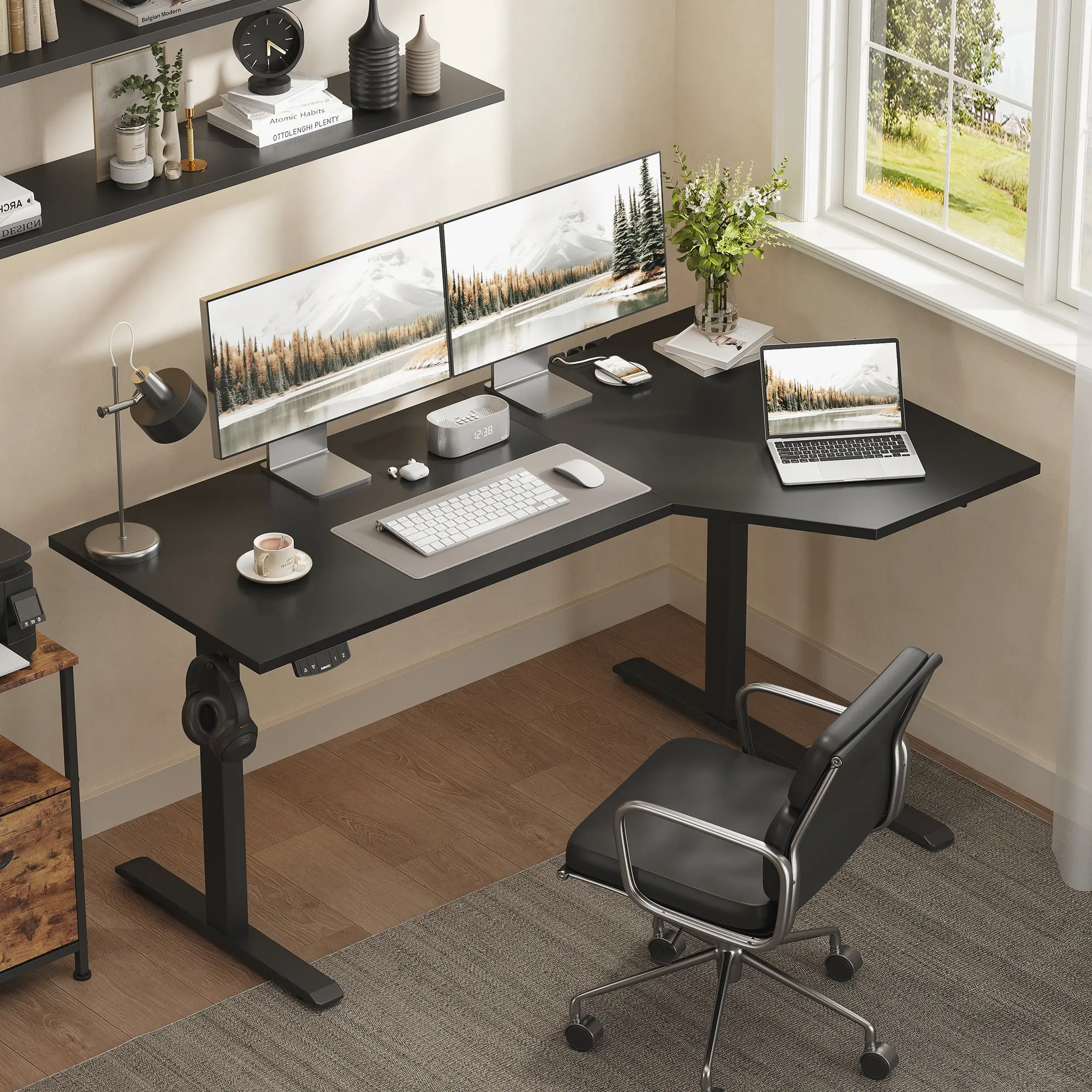·Spacious L-Shaped WorktopThe L-shaped desktop offers generous space for multiple monitors, laptops, and daily work essentials. Its corner-optimized layout helps make better use of available room, ideal for home offices, gaming stations, or professional workspaces.