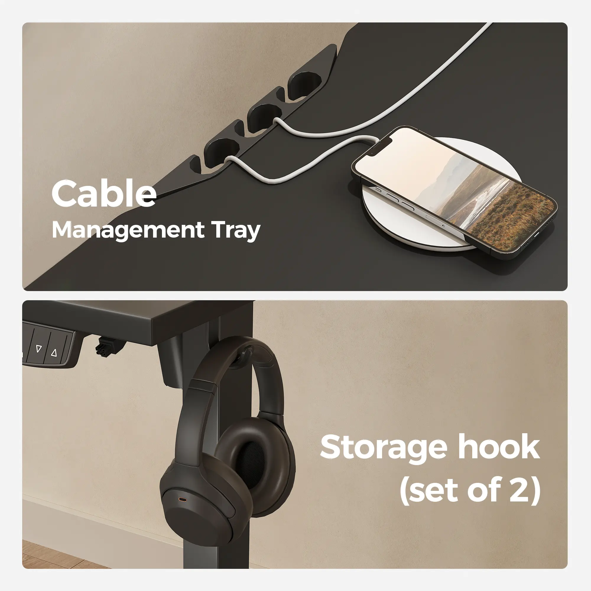 ·Smart Safety & Organized DesignBuilt-in anti-collision technology detects obstacles during movement and automatically retracts the desk by 1 inch to help prevent damage. Cable clips and dual side hooks keep wires, headphones, and accessories neatly organized for a clutter-free workspace.