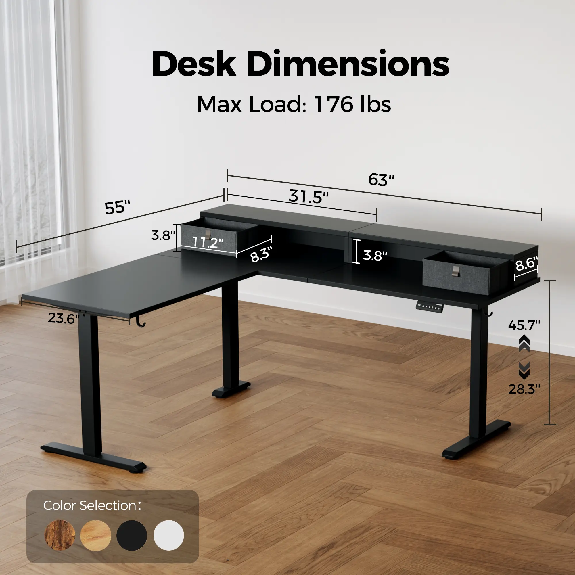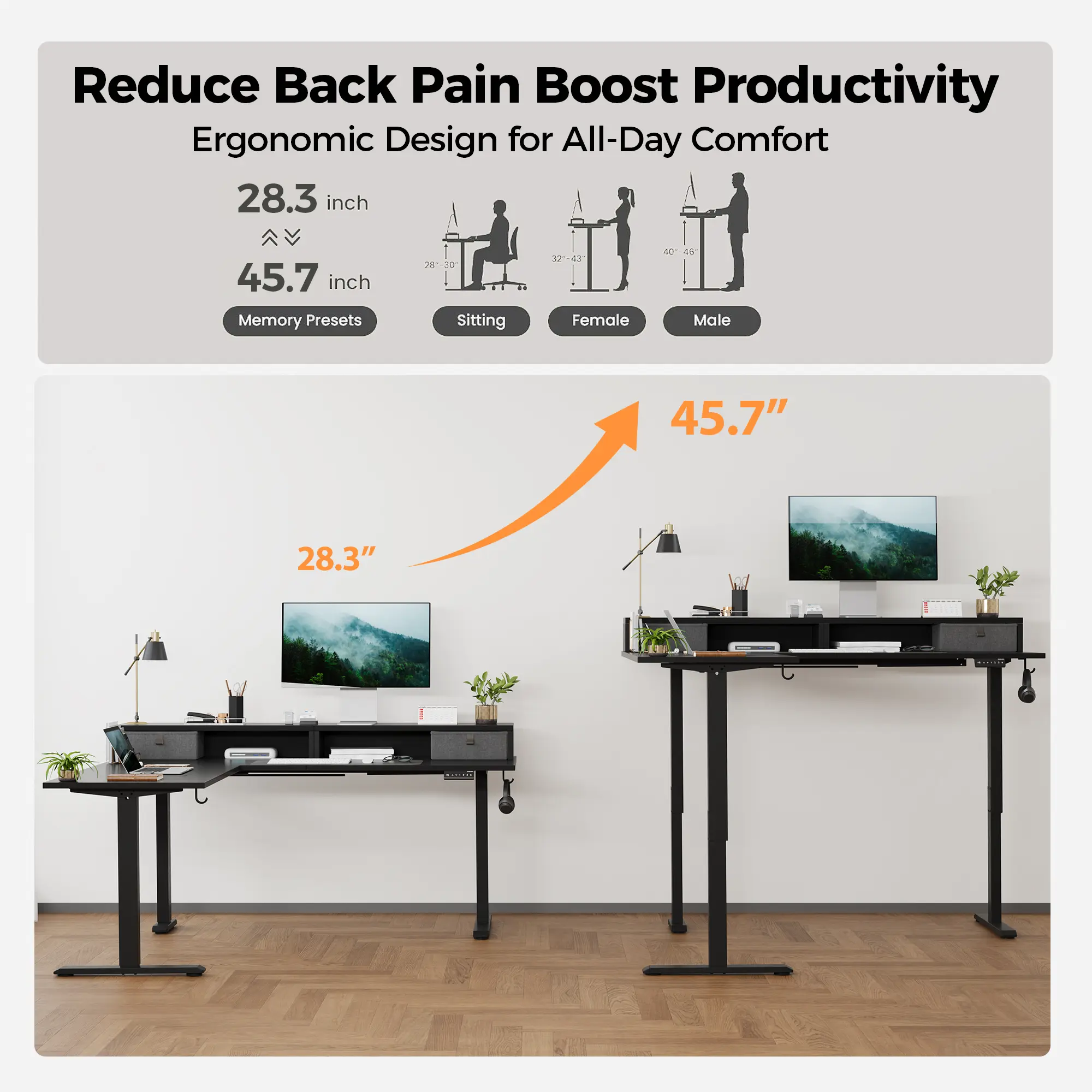 ·Electric Height Adjustable: Switch seamlessly between sitting and standing with the electric lift system. Our adjustable standing desk allows easy height customization from 28.3" to 45.7", powered by a quiet motor operating under 55 dB. The adjustable desk function supports personalized height settings, promoting ergonomic posture and reducing fatigue during long hours of work or play.