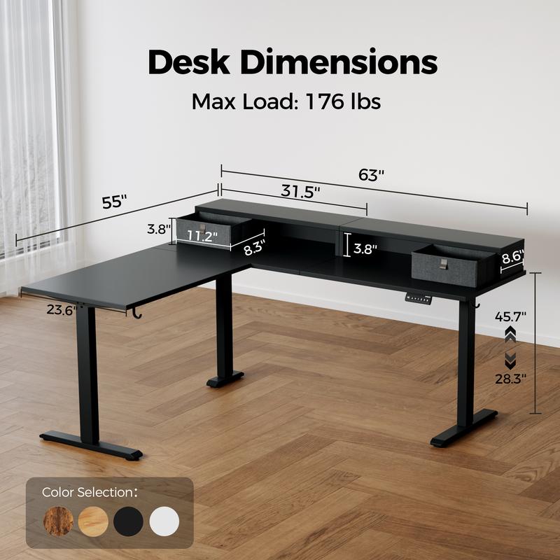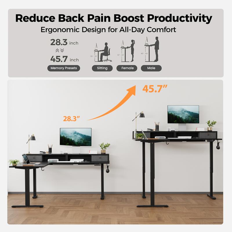 ·Spacious L Shaped Storage Design:This large L shaped standing desk provides generous space for multiple monitors, laptops, and office accessories. Designed with 2 storage drawers and monitor shelf, side hooks, and cable clip management, it keeps your home office or gaming setup tidy and well-organized.