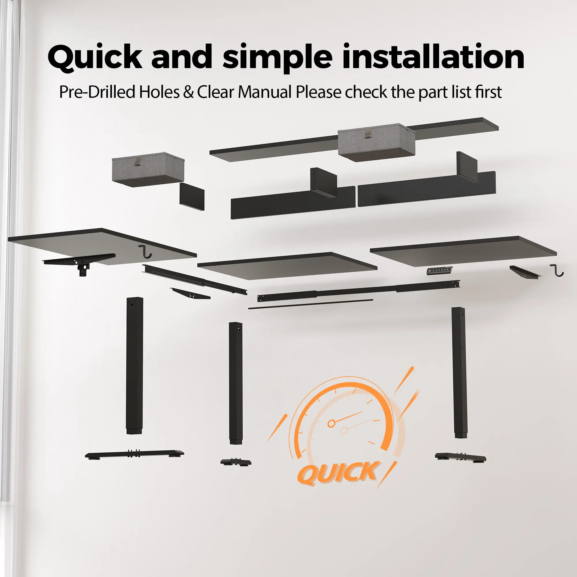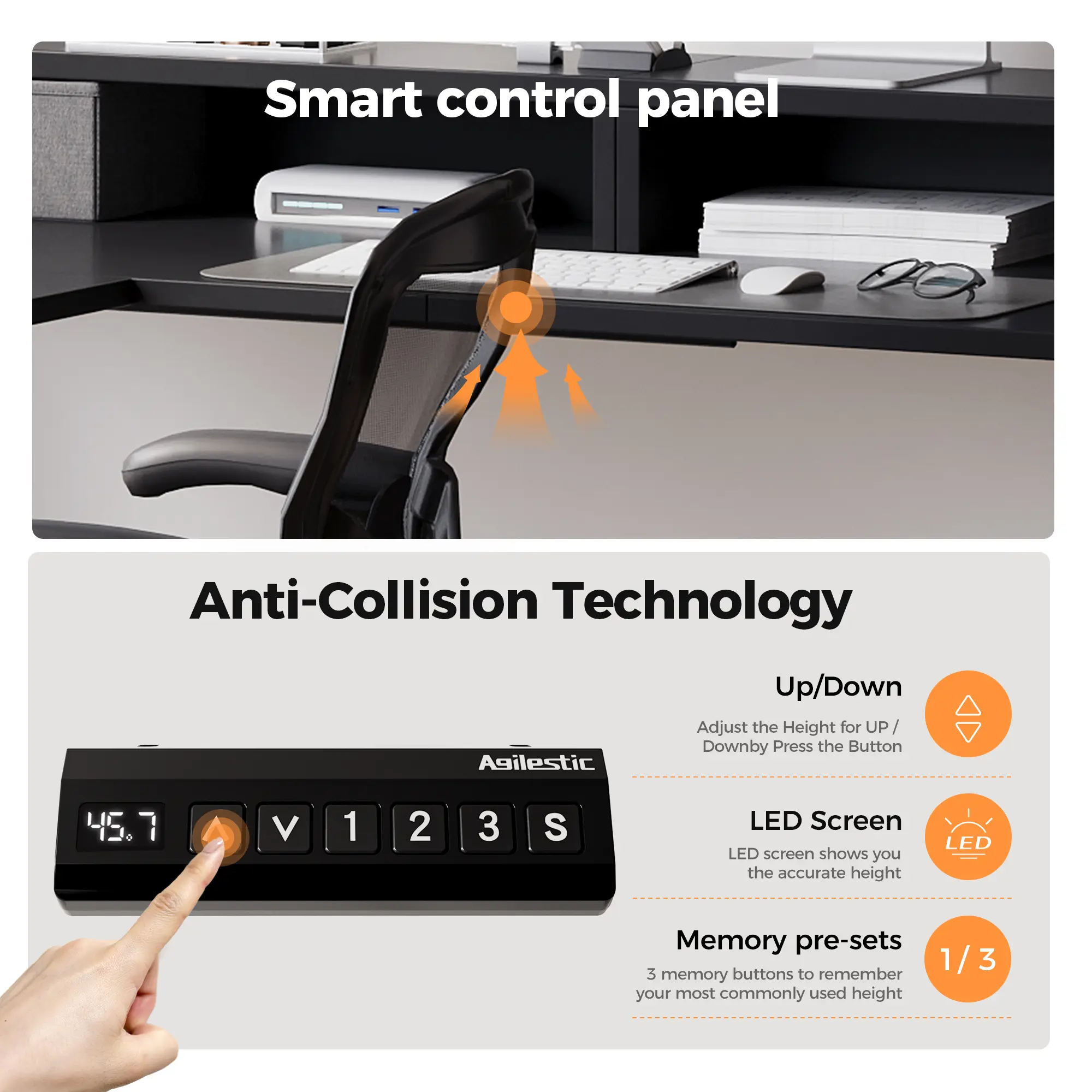 ·Memory Settings & Safety Protection: Store your ideal desk heights with the convenient memory function, allowing instant adjustment to your preferred positions. The built-in anti-collision system senses obstacles and automatically retracts 1 inch, protecting both the desk and nearby items from damage.