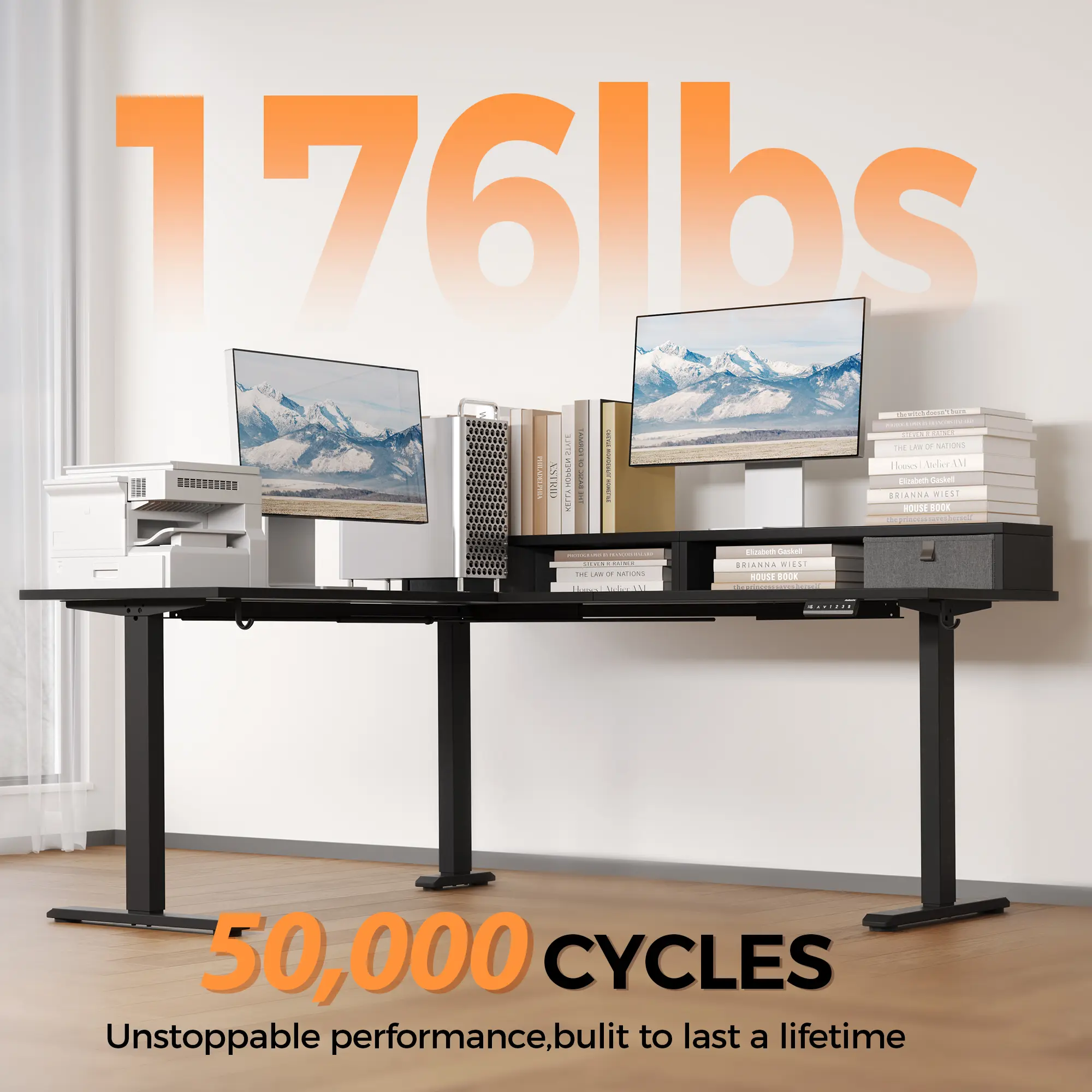 ·Durable Frame & Motor:Our sit stand desk is built with an industrial-grade steel frame and a sturdy T-shaped base, supporting up to 176 lbs with ease. The powerful motor, tested through 50,000 lift cycles, delivers smooth and reliable performance, ensuring long-lasting durability for everyday use.