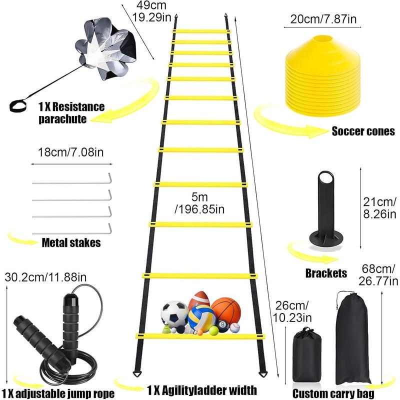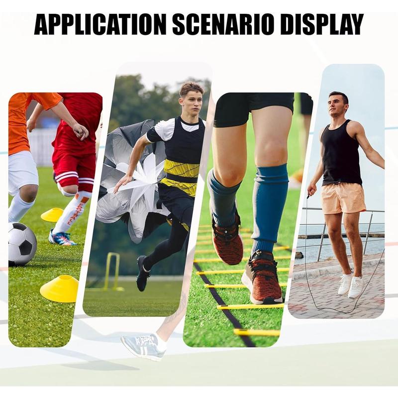 ·【Football Training Equipment Set】 Includes 1 yellow speed training ladder with 4 steel spikes (20 feet long, 12 rungs), 12 football cones, 1 running resistance umbrella, 1 jump rope, 1 carry bag. It can meet your training requirements and make your life healthier