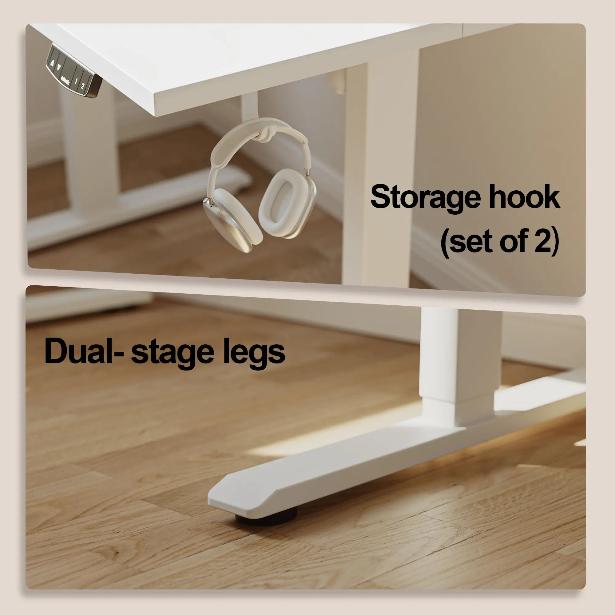 The wide surface accommodates multiple monitors and accessories with ease. Dual side hooks offer convenient storage for headphones, bags, helping keep your workspace tidy. Comes with all necessary tools and a step-by-step guide for hassle-free assembly.